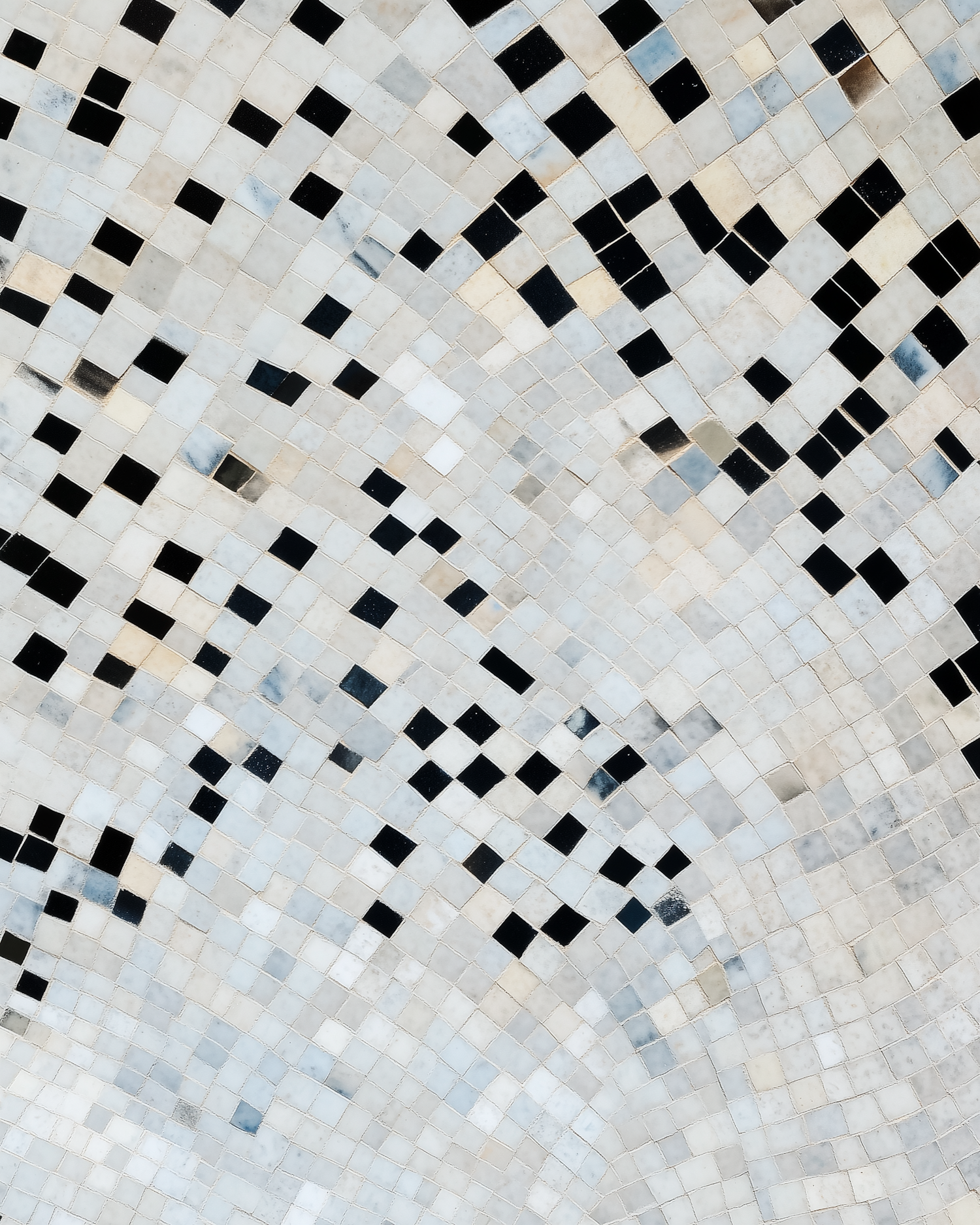 Intricate mosaic pattern with wave-like tile arrangement in white, beige, and black, creating a dynamic and fluid visual effect.