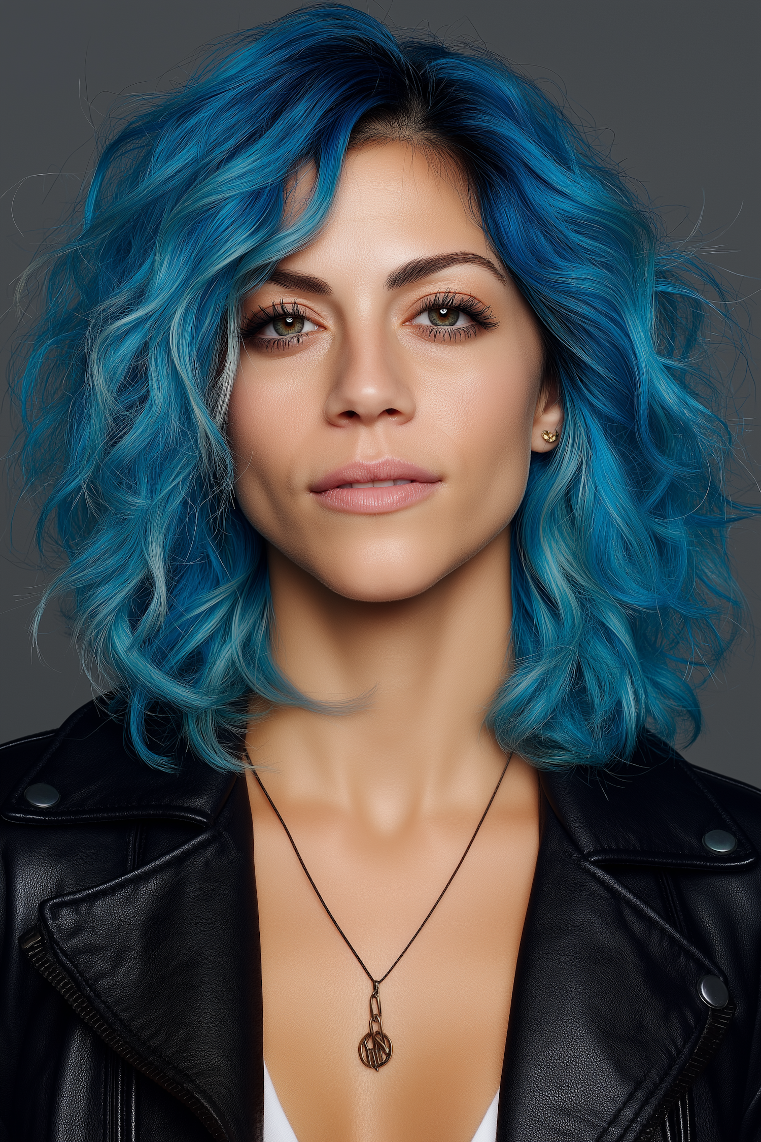 A striking portrait of a person with vibrant blue hair, wearing a leather jacket and a pendant necklace, set against a neutral background.