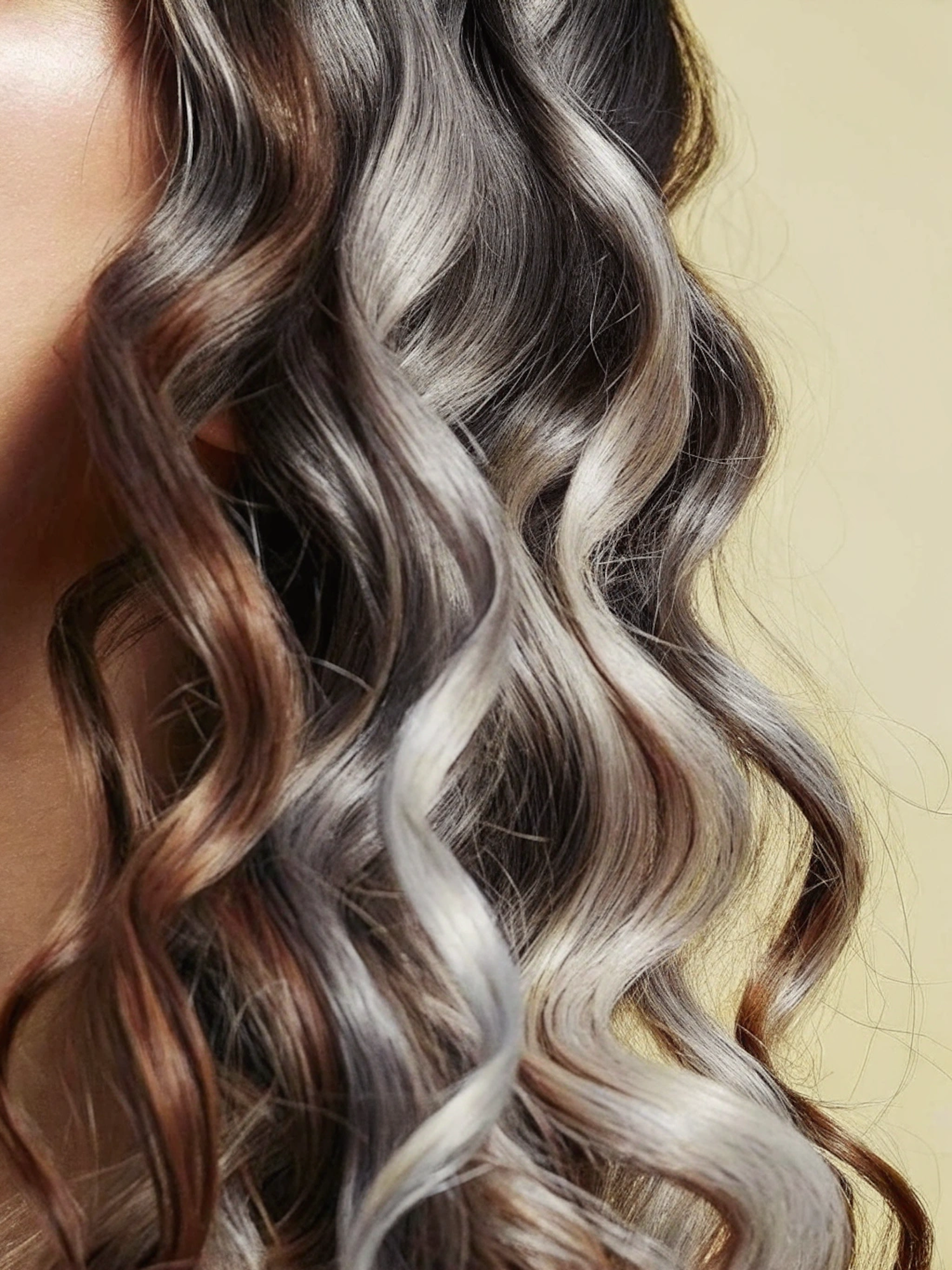 Close-up of wavy hair with silver, gray, and brown tones, showcasing glossy, defined strands against a muted beige background.