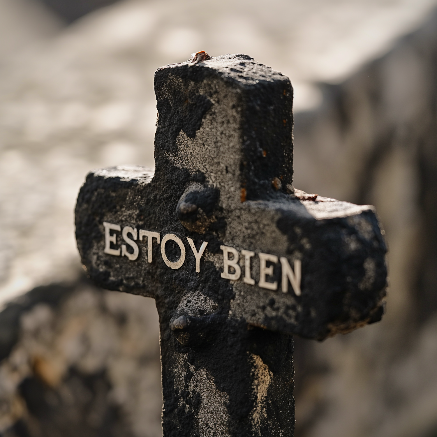 A weathered stone cross with 'ESTOY BIEN' engraved, set against a blurred cemetery background, evokes a somber yet peaceful mood.