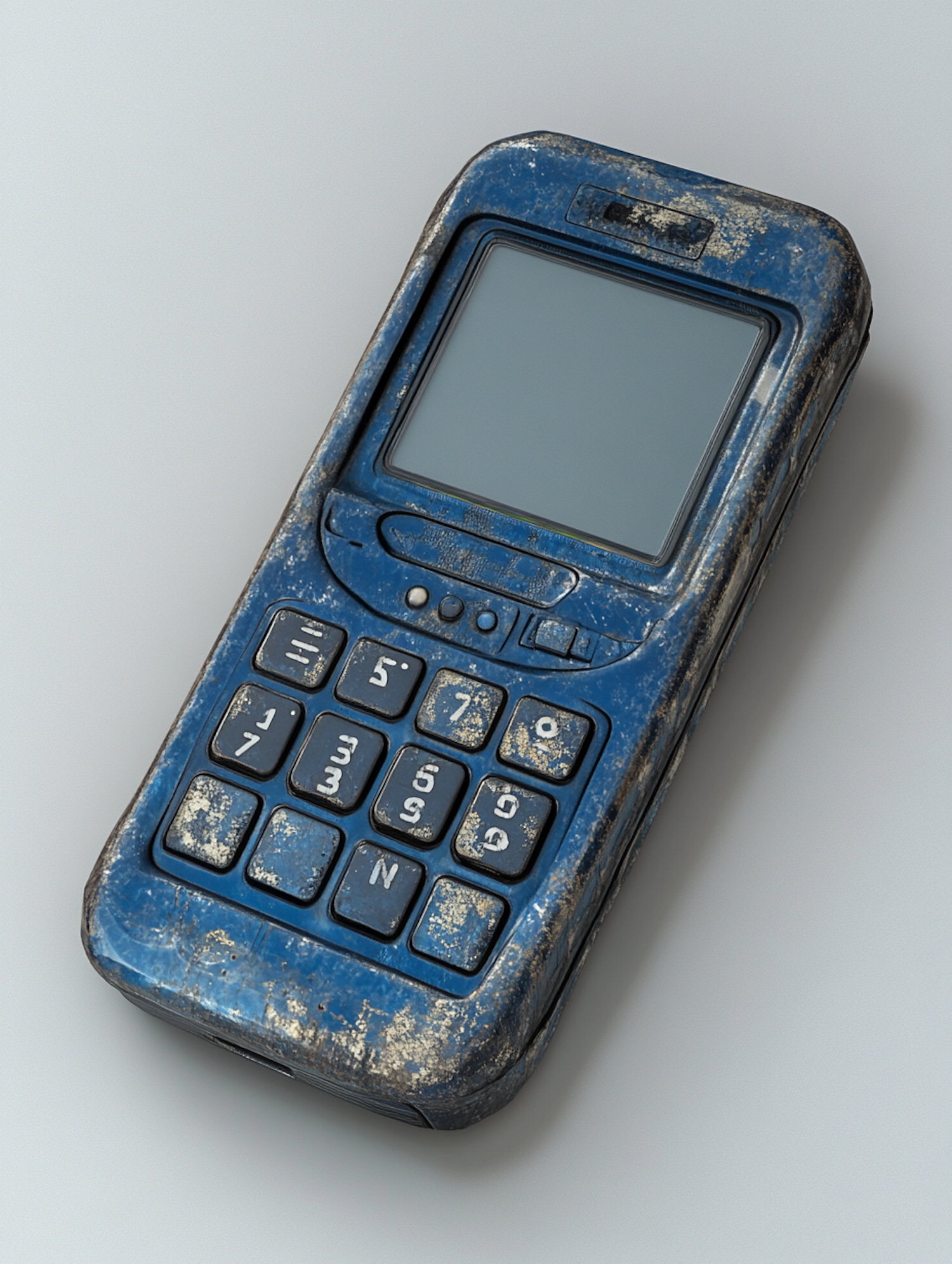 A rugged, weathered blue mobile phone with a keypad, showing heavy wear and scratches, likely designed for durability in tough conditions.