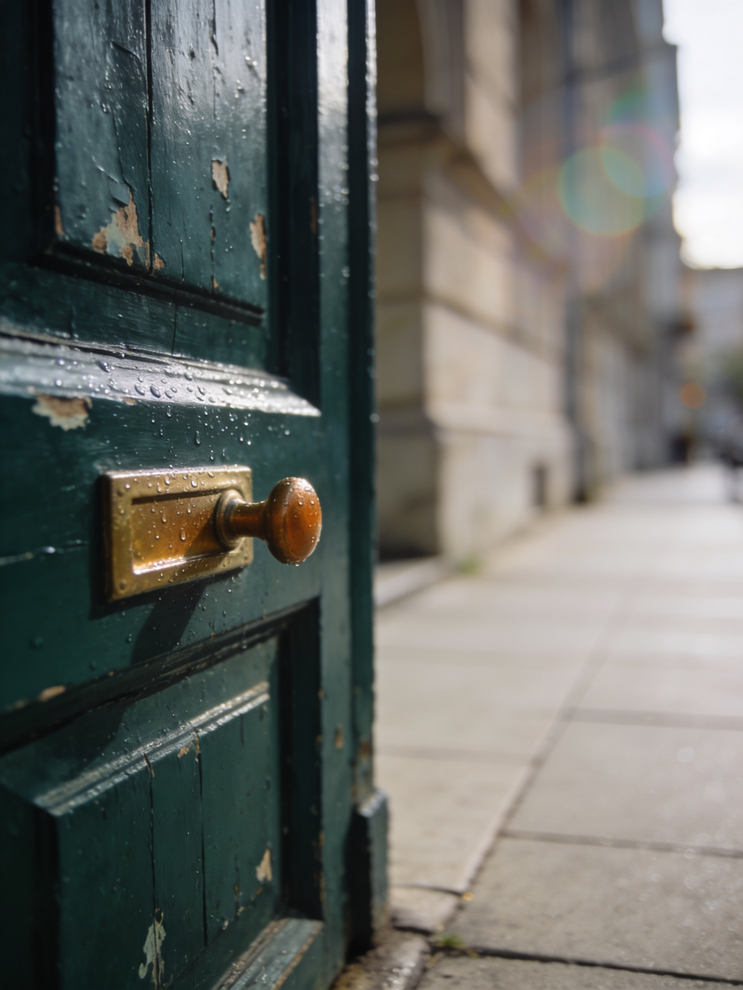 Cinematic street photography, same photographer, same film: muted palette, soft daylight, gentle grain, subtle halation, shallow depth, 50mm lens look. Scene: close street view of a weathered building facade with a dark forest-green wooden door, worn paint texture, warm brass handle, slight moisture on surfaces, empty sidewalk, minimalist composition. No logos, no readable text, no brands.
