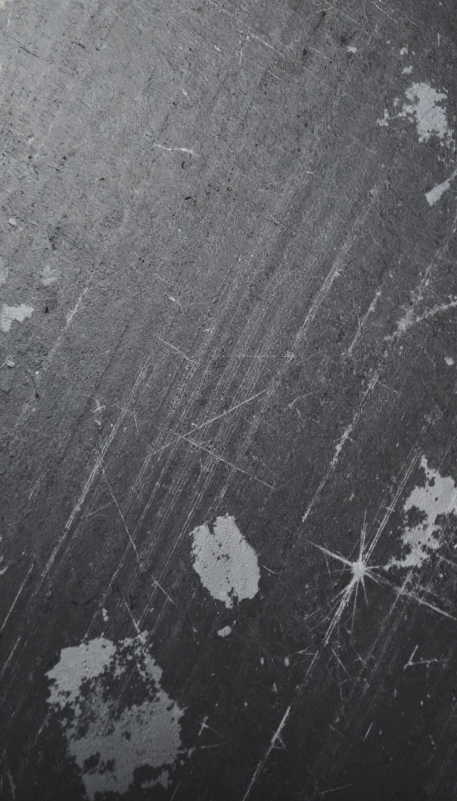 Close-up of a scratched and textured dark gray surface with white patches, creating a rugged and worn appearance.