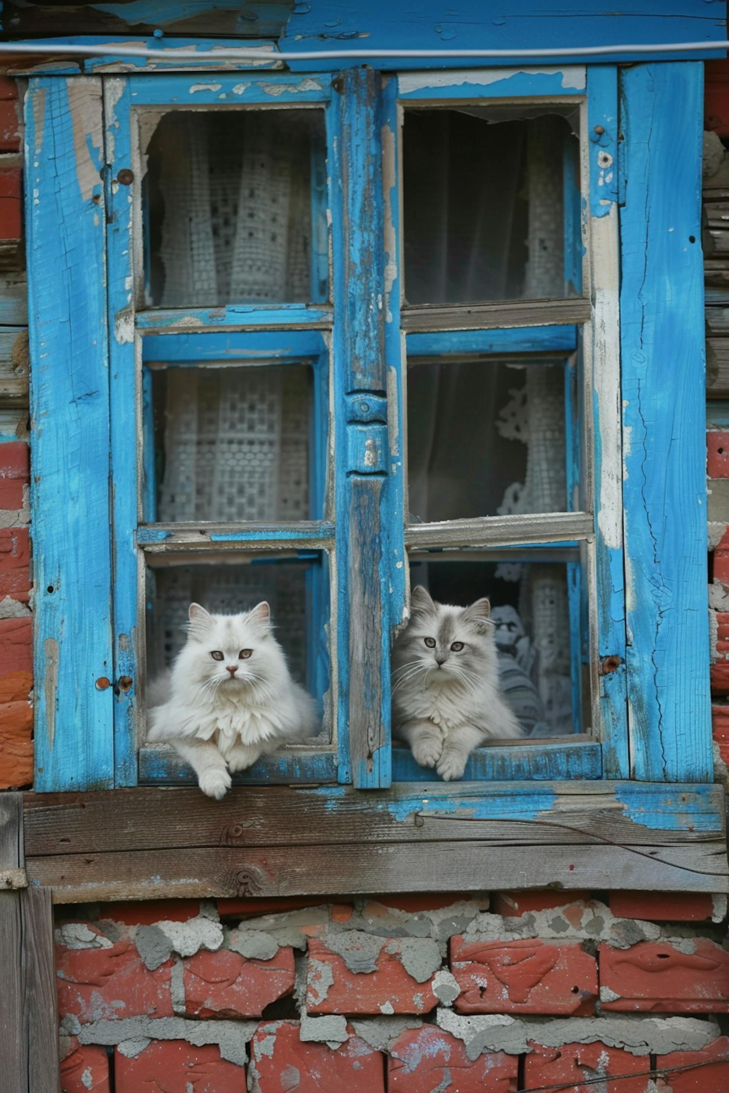 Two fluffy white cats rest on a rustic blue windowsill with peeling paint, framed by lace curtains and a red brick wall.
