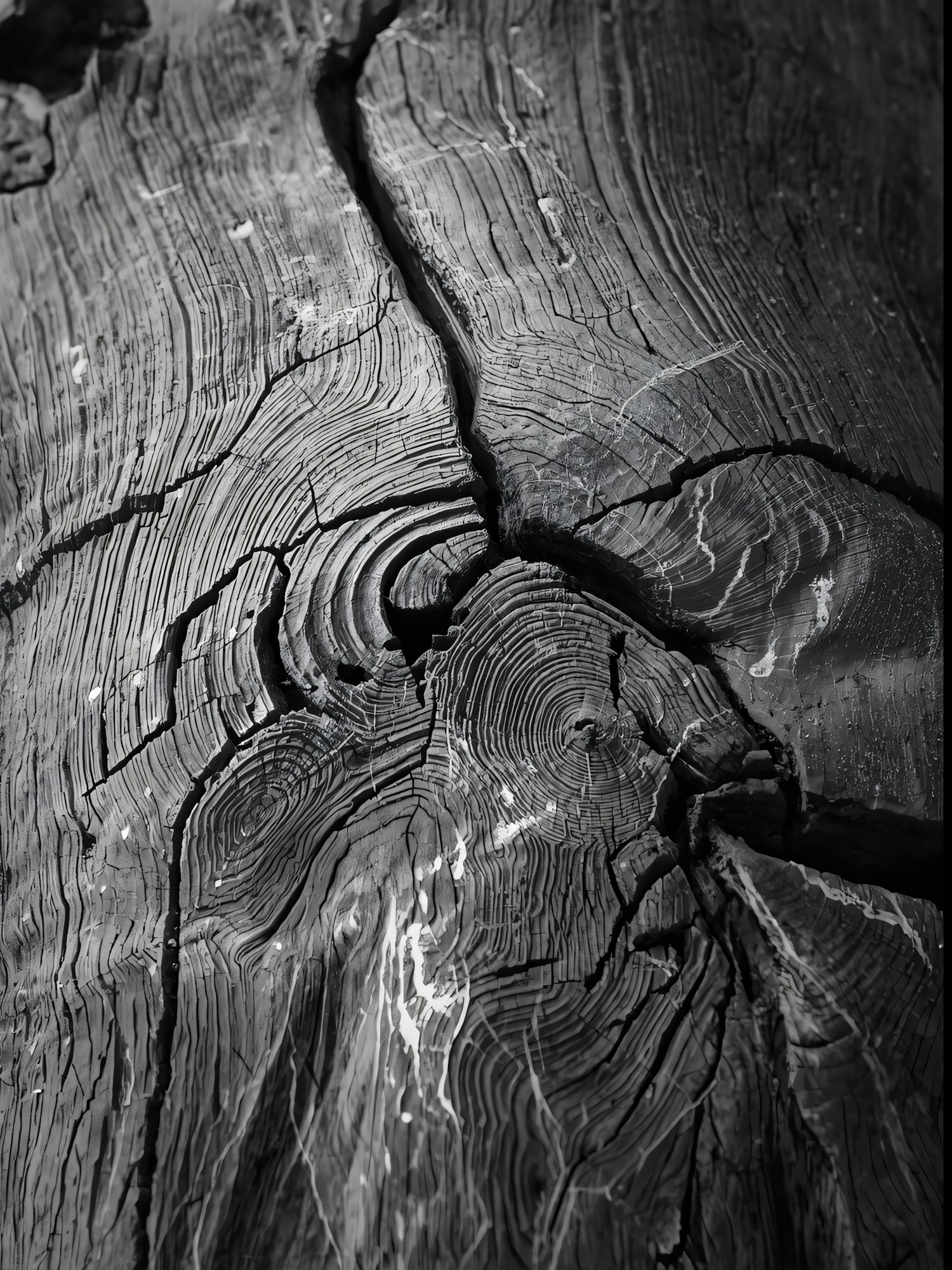 Close-up of a weathered wooden surface with detailed grain patterns and cracks, emphasizing texture and natural beauty in monochrome.