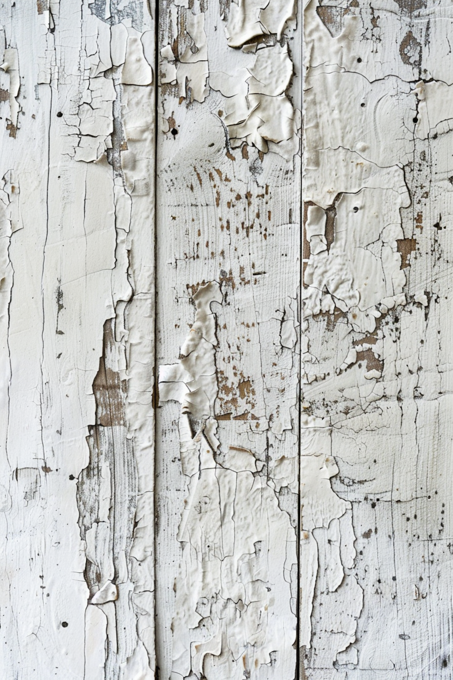 Aged wooden planks with peeling white paint reveal rustic textures and natural wood beneath, creating a vintage, weathered look.