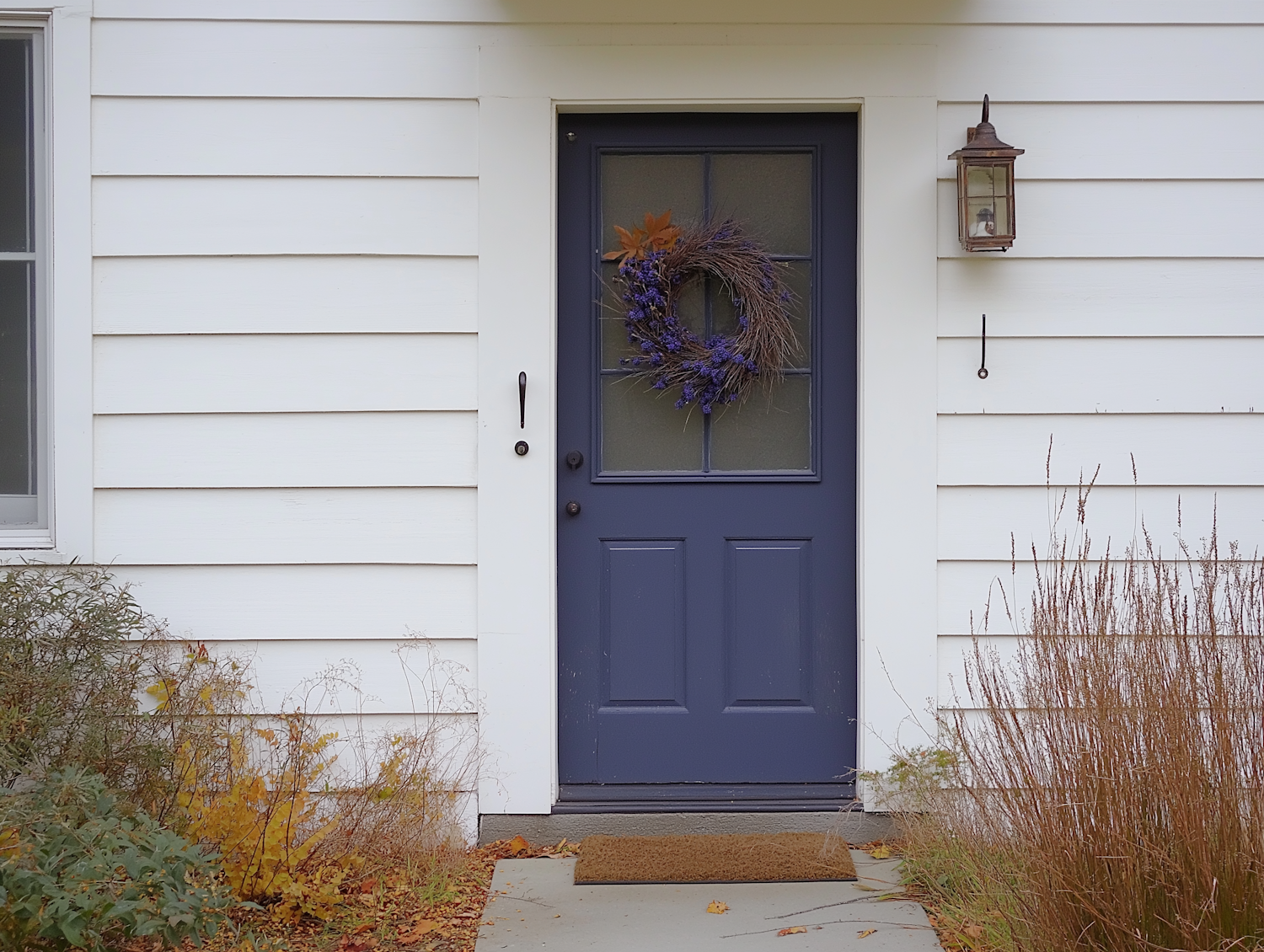 Charming blue door with a rustic wreath, vintage lantern, and autumnal foliage on a white paneled house exterior.