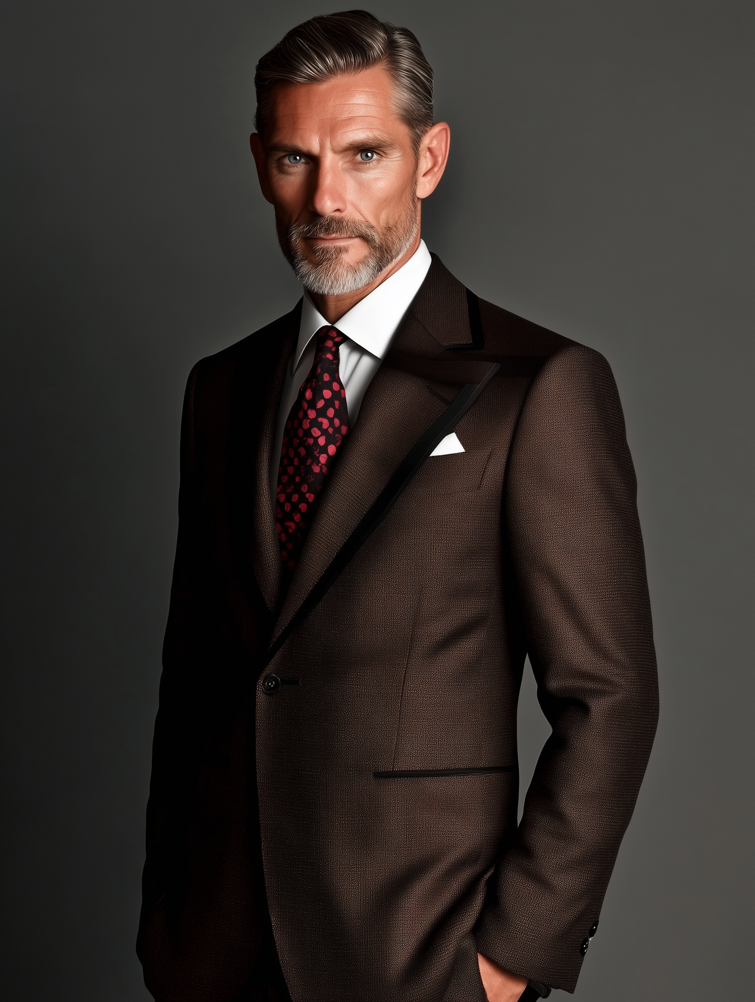 Elegant man in a brown suit with a red patterned tie, exuding confidence and style against a gray background.
