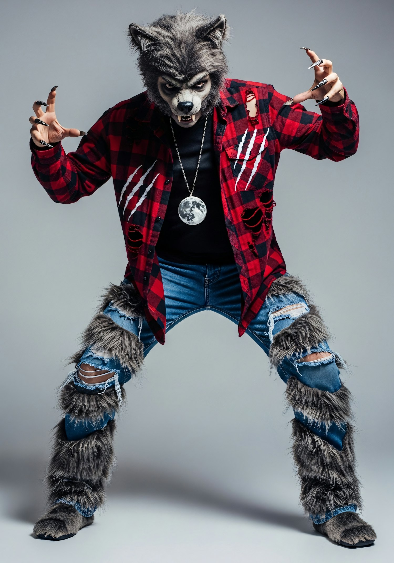 A person in a werewolf costume with a plaid shirt, ripped jeans, and fur details, posing dynamically with clawed hands extended.