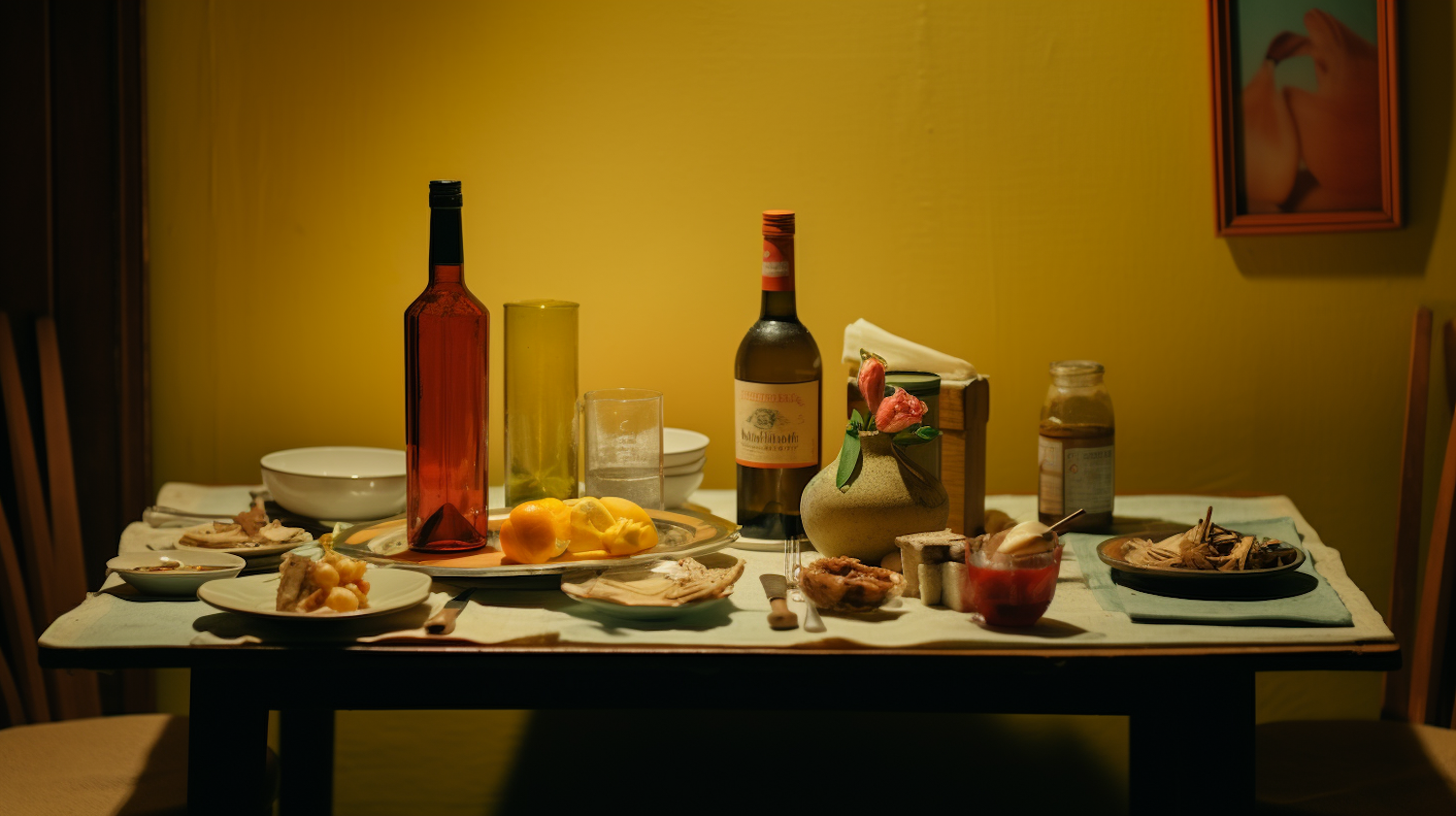 Cozy dining table with wine, food, and flowers against a warm yellow wall, creating an inviting atmosphere.