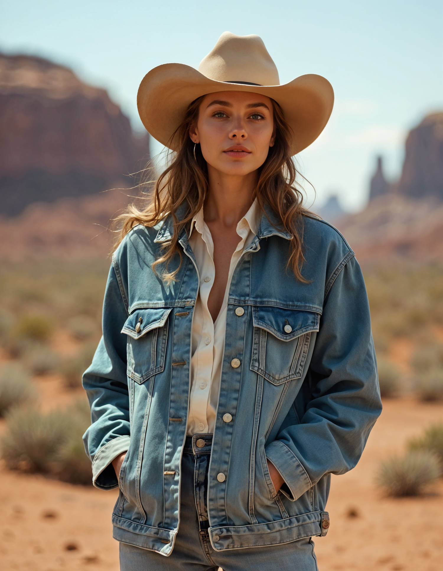 Stylish woman in a cowboy hat and denim outfit standing in a scenic desert with rugged rock formations in the background.