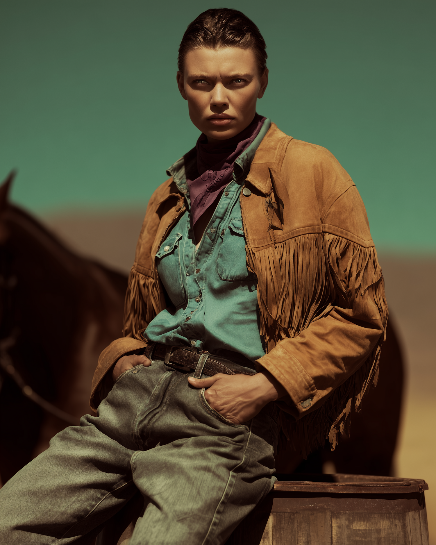 A person in a western outfit with a fringed jacket and denim jeans stands confidently in a desert setting with a horse in the background.