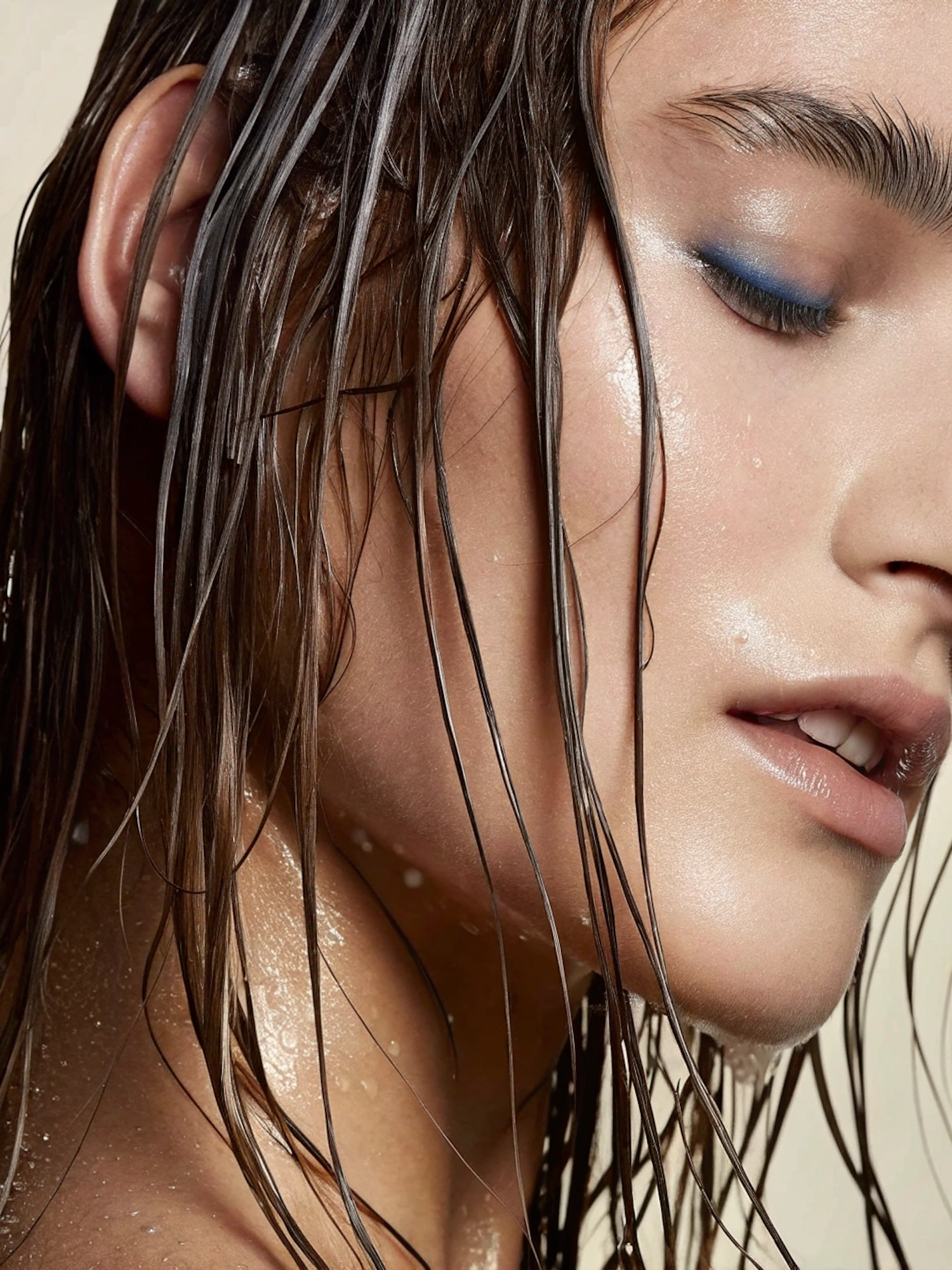 Close-up of a person with wet hair, glowing skin, and bold blue eyeshadow. Dewy aesthetic with water droplets adding a fresh vibe.