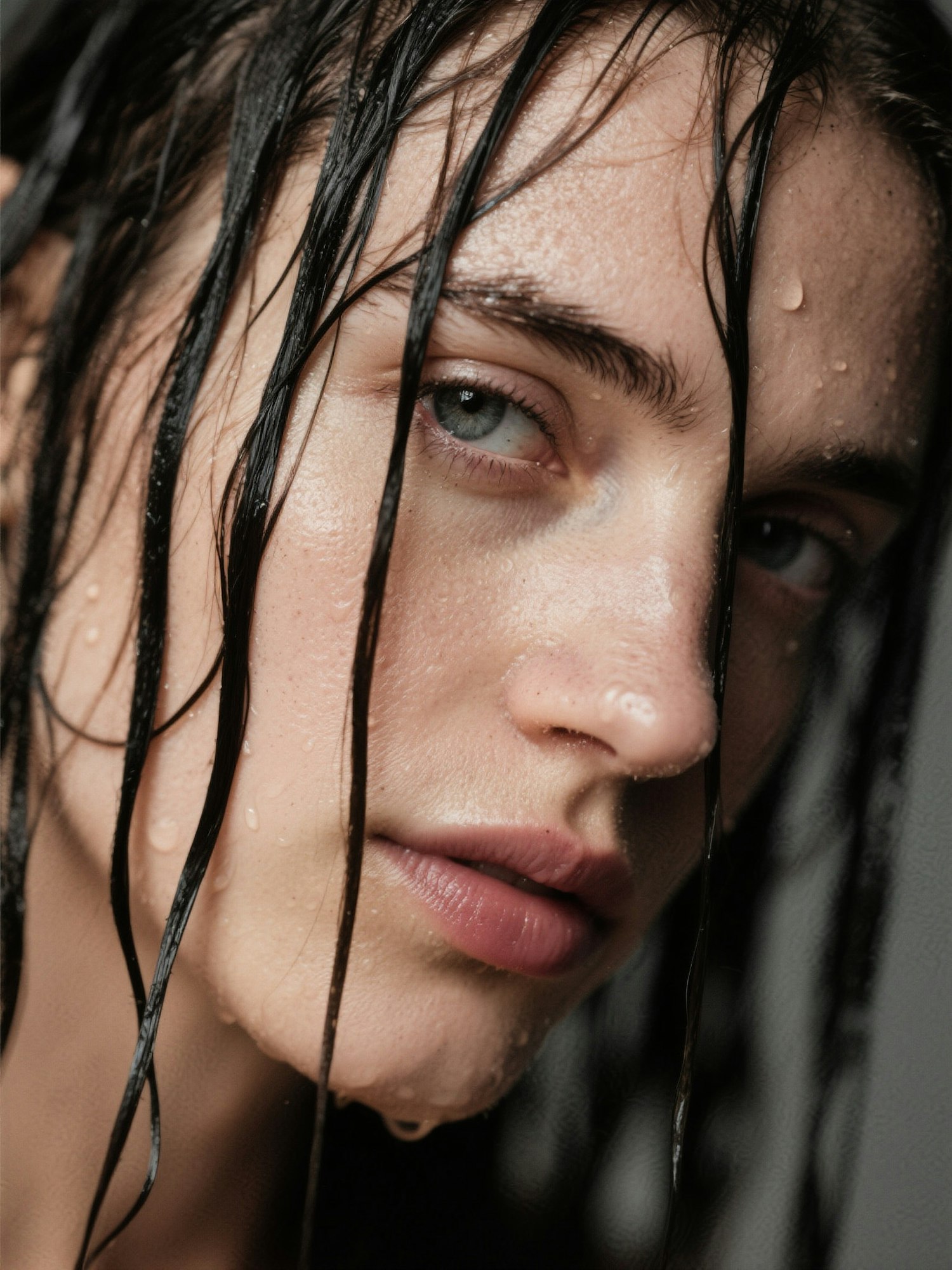 A portrait shot of a person with wet hair clinging to their face in artistic strands. The skin appears fresh and dewy, with soft diffused lighting enhancing the textures. Focus on the contrast between wet strands and smooth skin. Stylized, moody and editorial.