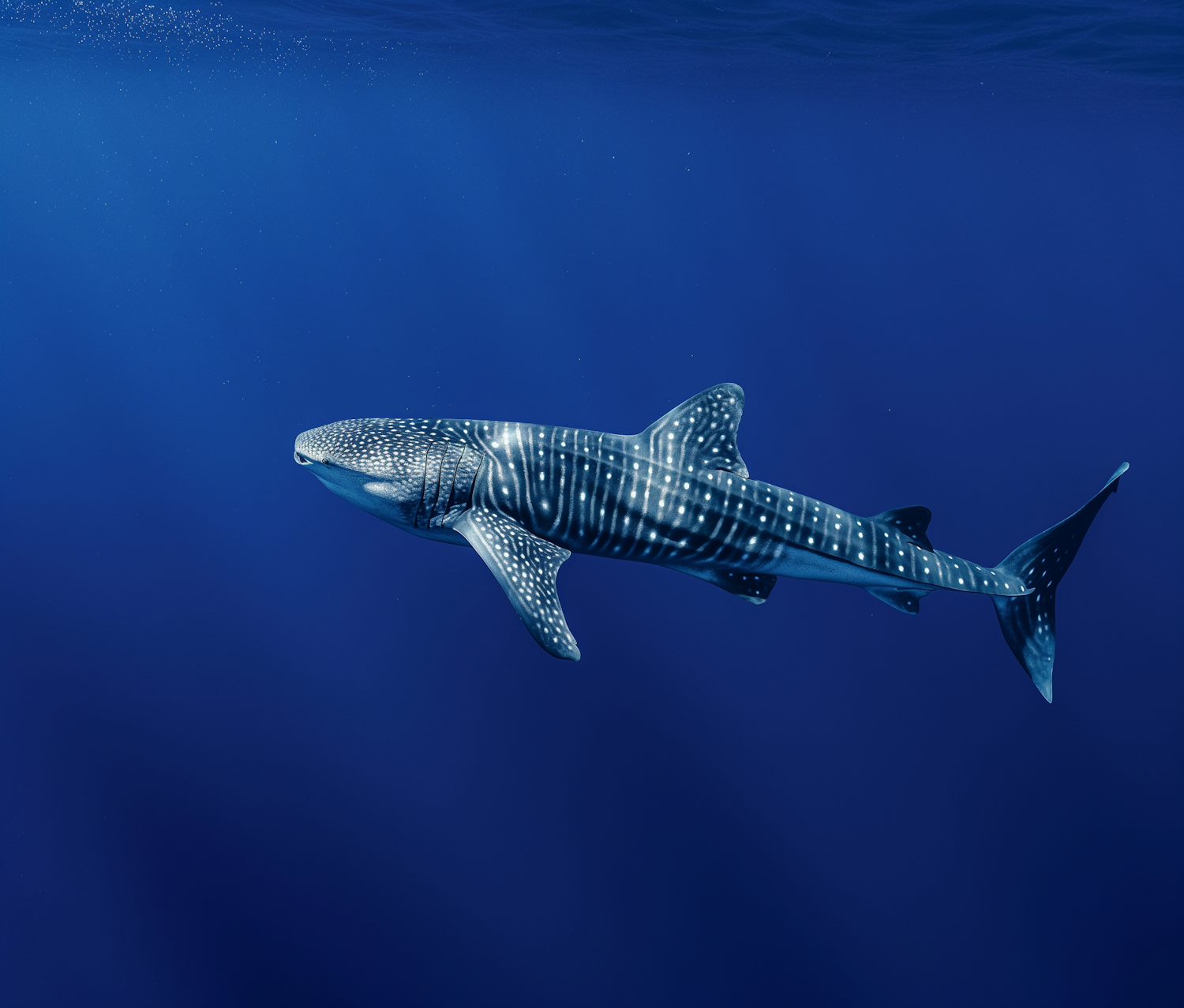Majestic whale shark swimming gracefully in deep blue ocean, adorned with unique white spots and stripes, under gentle sunlight.