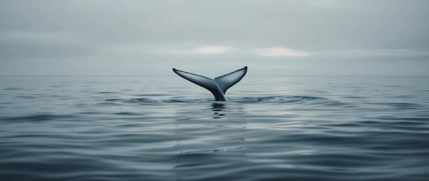 Majestic whale tail emerging from calm ocean waters under a cloudy sky, creating a serene and tranquil scene.
