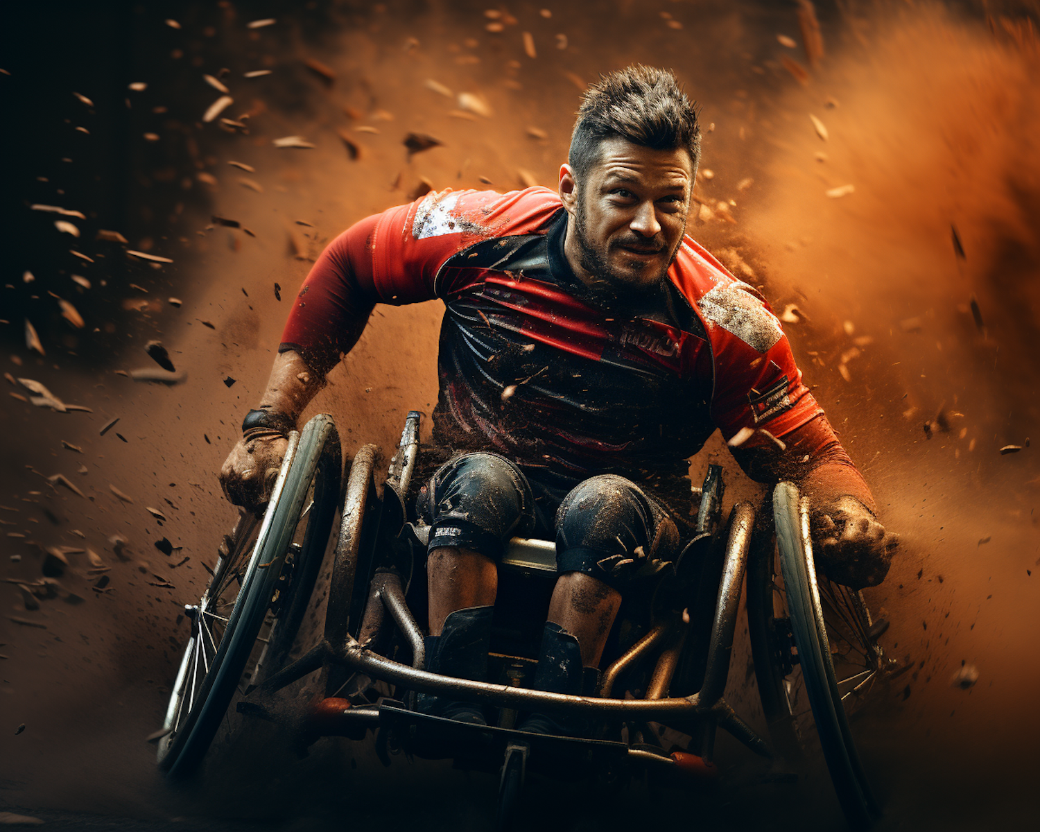 Dynamic image of a determined athlete in a wheelchair racing through dust, showcasing strength and resilience.