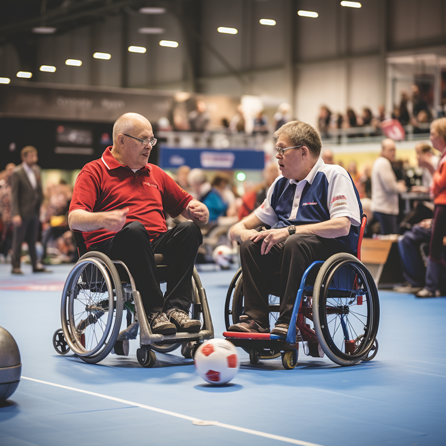 Two elderly men in wheelchairs converse on a sports court, with a soccer ball between them, surrounded by a lively crowd.