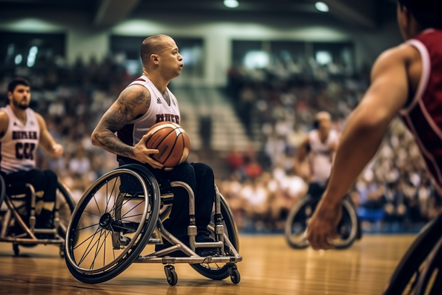 Intense wheelchair basketball game with focused players on a vibrant court, showcasing athleticism and determination.