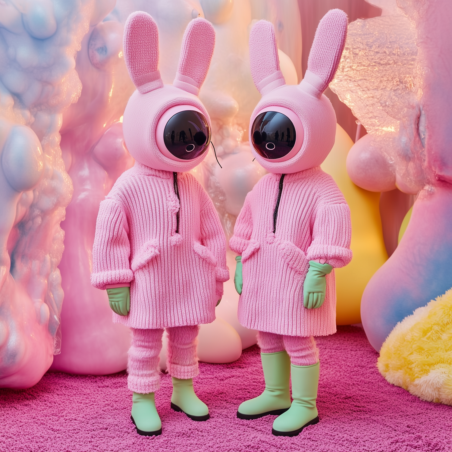 Two humanoid figures in pink bunny-inspired costumes with glossy black lenses stand in a surreal pastel environment.