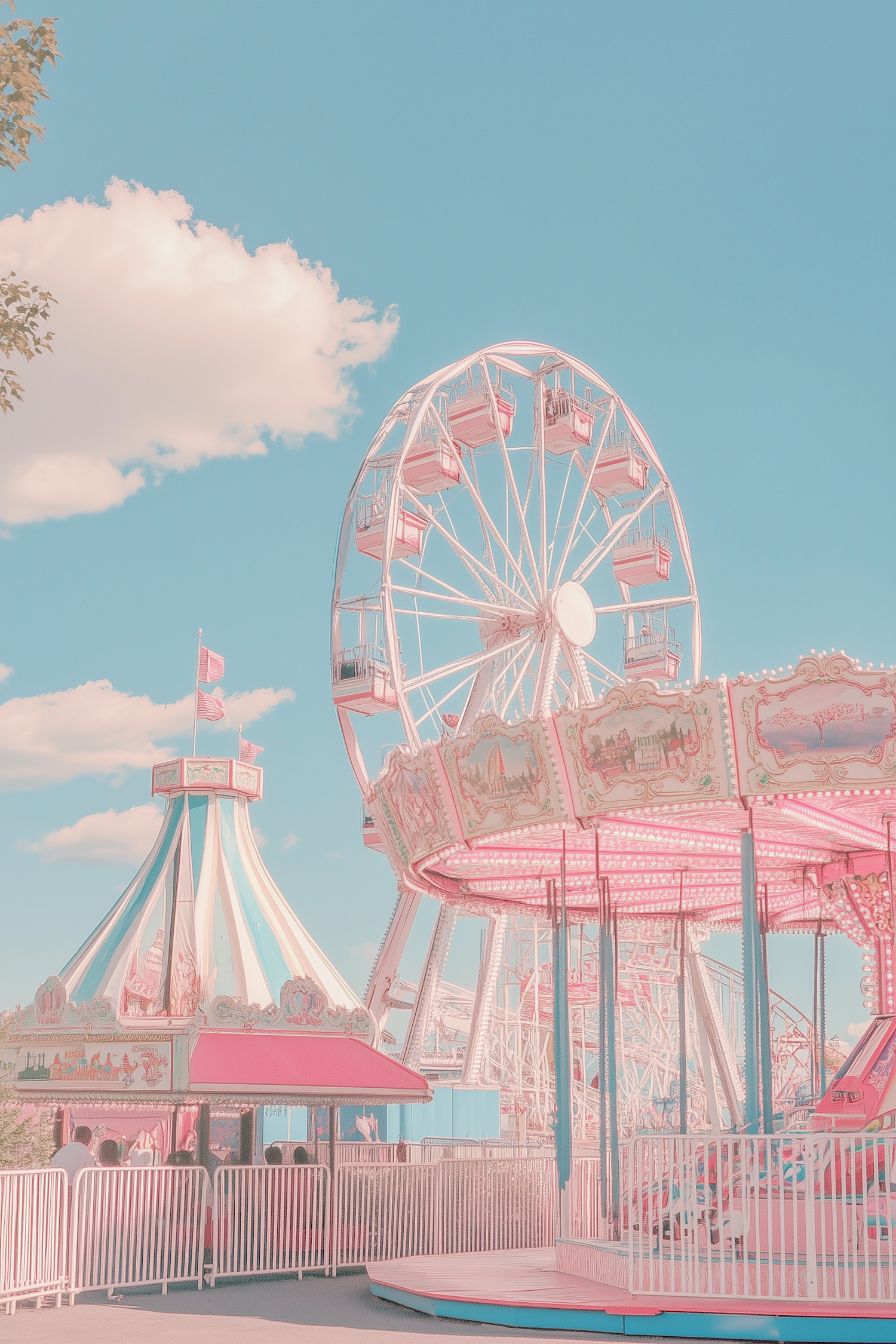 Pastel amusement park scene with a Ferris wheel, carousel, and striped tent under a soft blue sky with fluffy clouds.