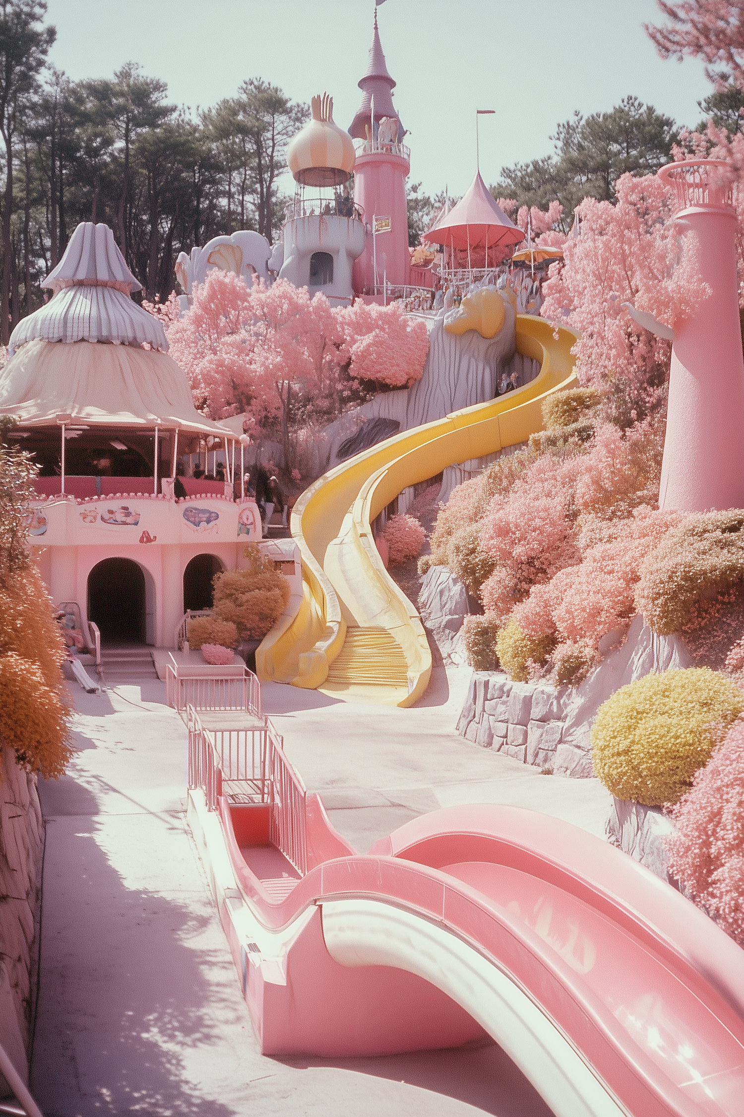 Whimsical amusement park with pastel pinks and yellows, featuring a winding slide and castle-like structures amidst fluffy pink trees.