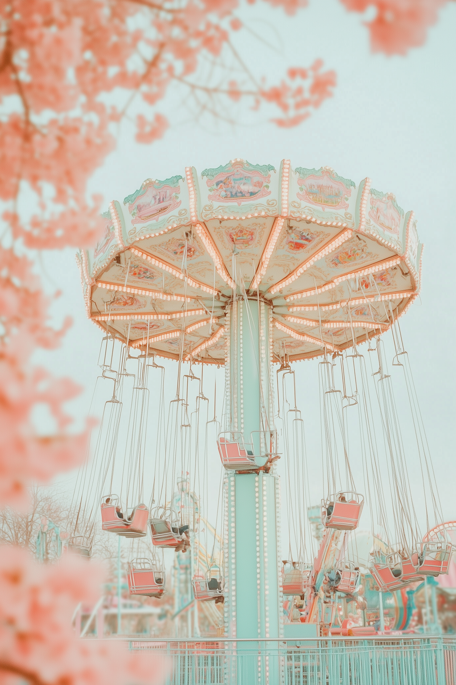 Dreamy vintage swing carousel with pastel colors and cherry blossoms, creating a nostalgic and enchanting fairytale atmosphere.