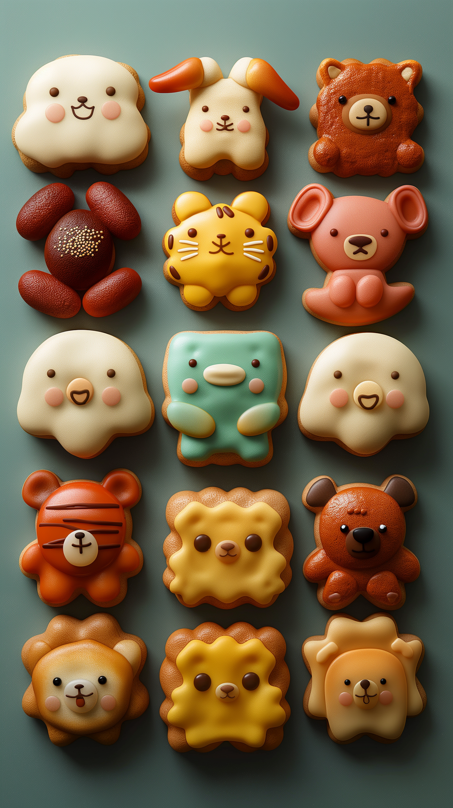 Adorable animal-shaped cookies with vibrant icing designs, featuring bears, rabbits, lions, and more on a teal background.