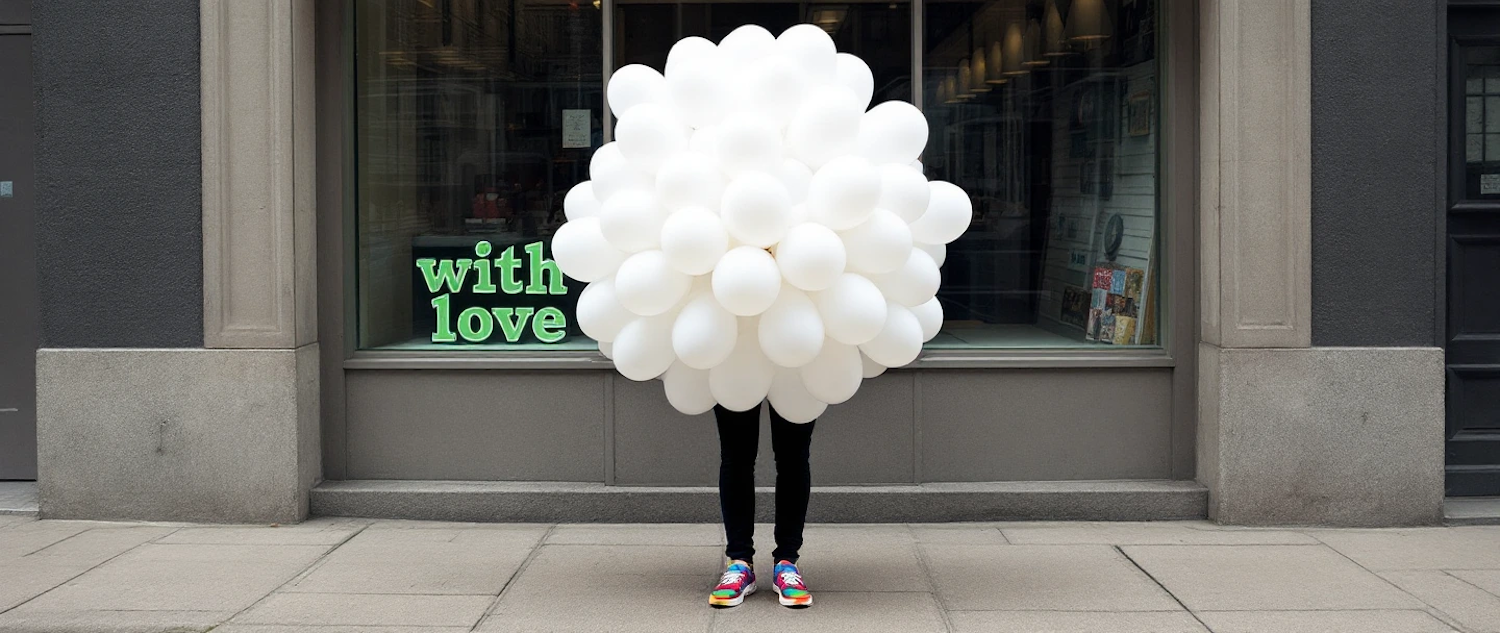 A person hidden by white balloons stands in front of a storefront with 'with love' text, wearing colorful sneakers and black pants.