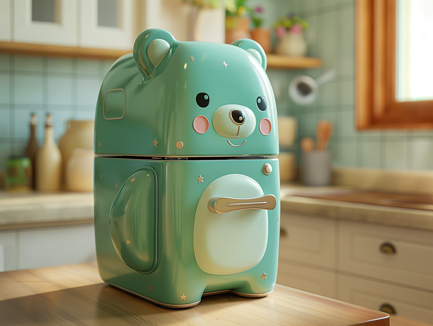 Adorable bear-shaped mini fridge in pastel teal with star patterns, perfect for a whimsical kitchen touch.