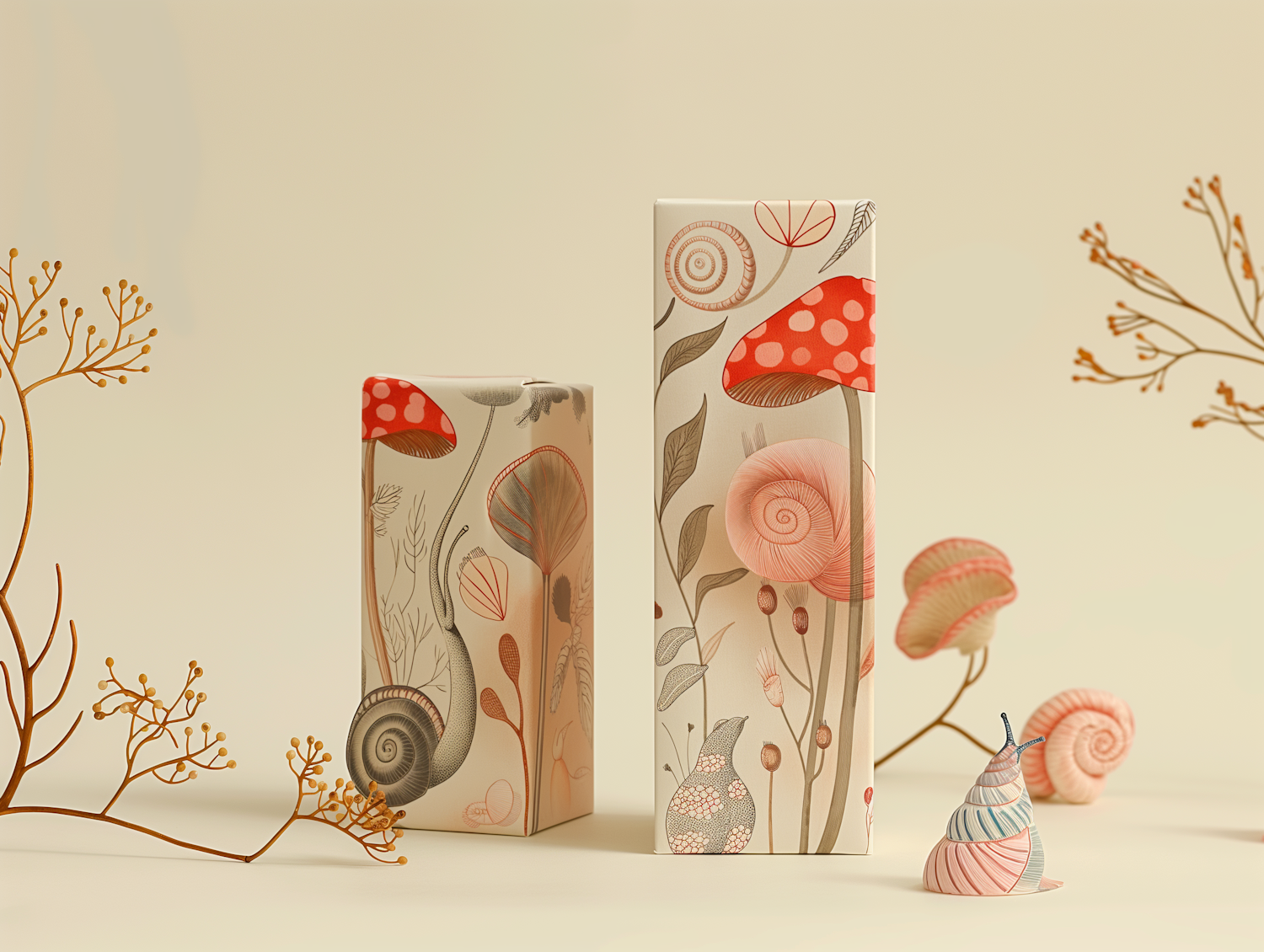 Whimsical packaging with snails and mushrooms on beige boxes, surrounded by delicate plant stems and a colorful snail figurine.