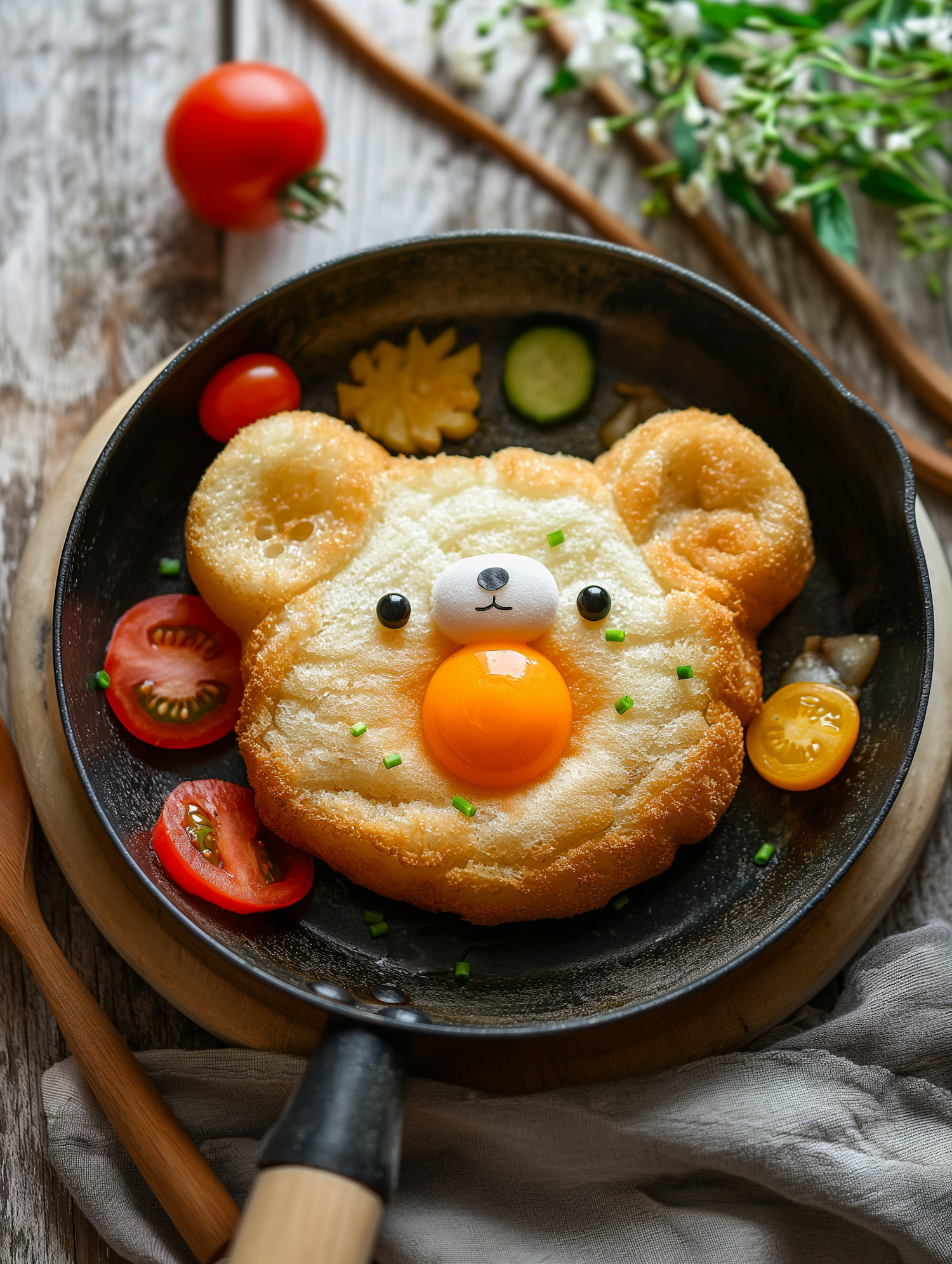 Adorable bear-shaped fried egg in a skillet with colorful garnishes, perfect for a playful breakfast.
