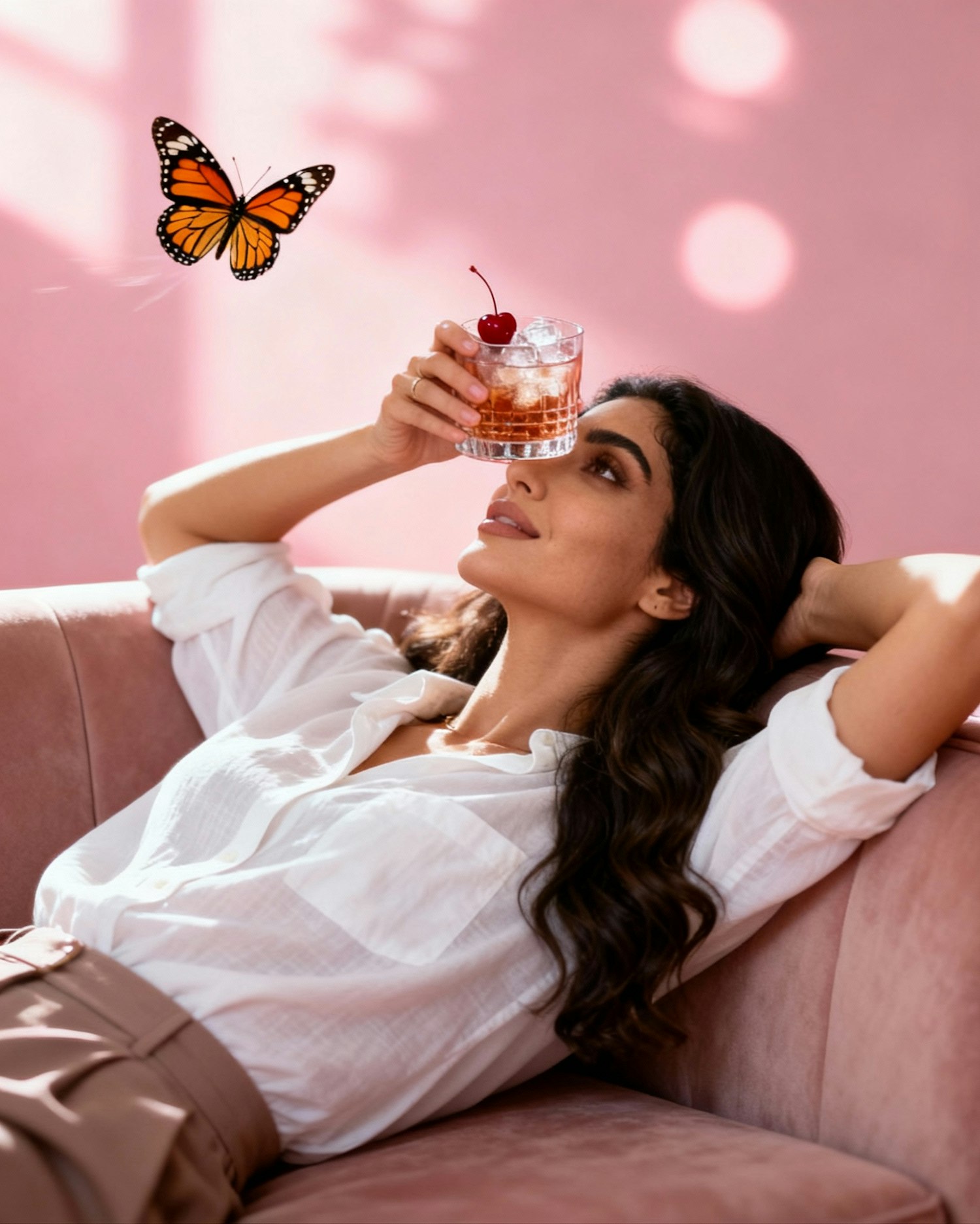 A woman relaxes on a pink couch, holding a drink with a cherry garnish, as a butterfly flutters nearby in a serene pink-lit setting.