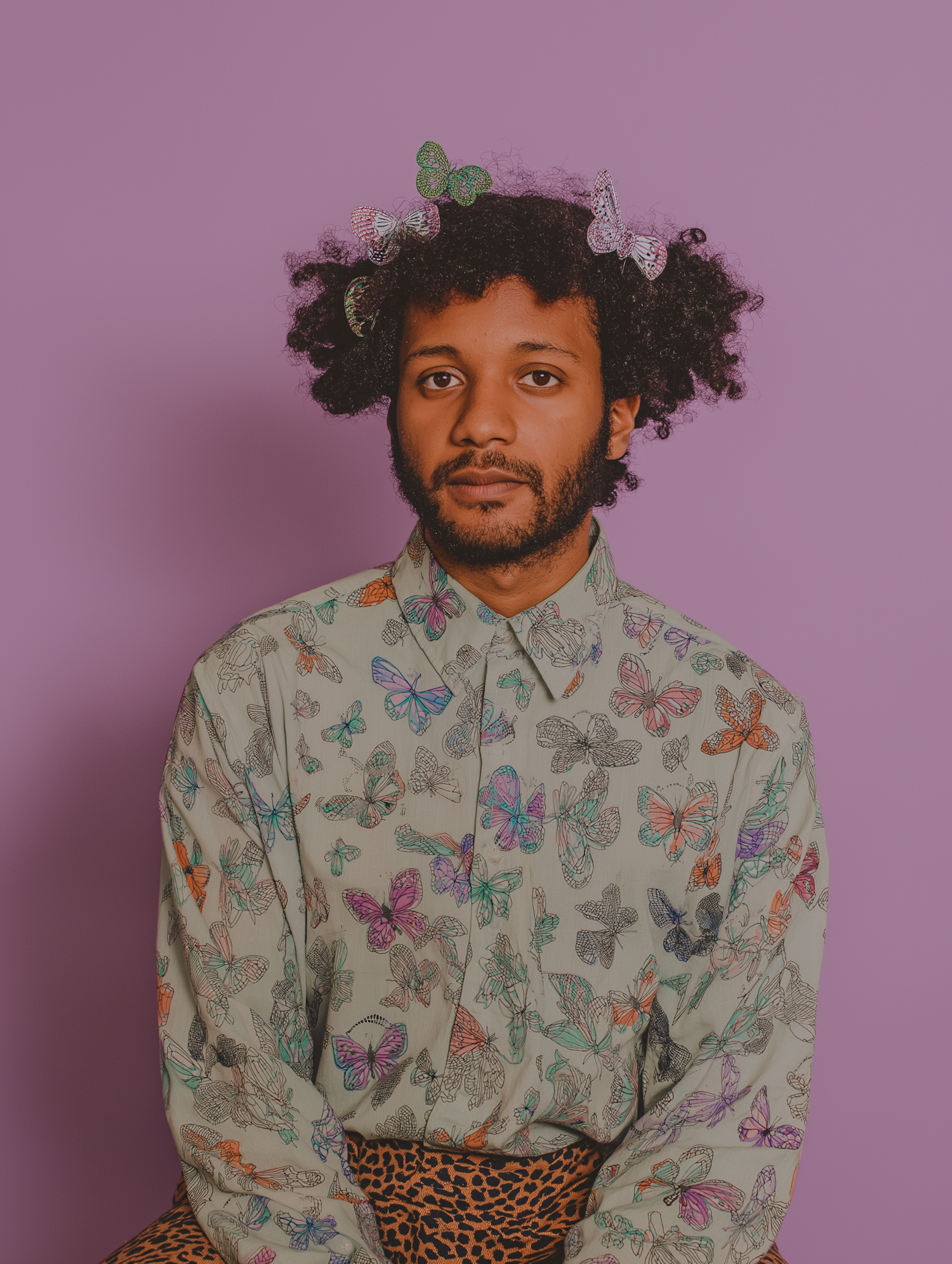 A person with butterfly clips in their hair, wearing a butterfly-print shirt and leopard-patterned pants, against a purple background.
