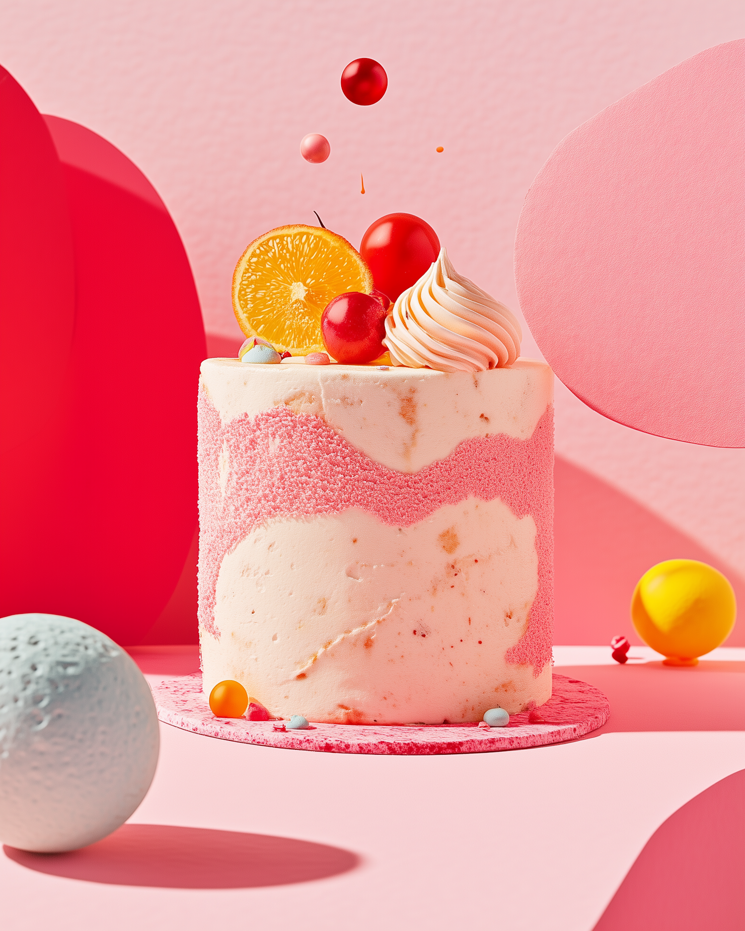 A vibrant cake with pink and white marbling, topped with orange and cherries, set against a playful pink background.