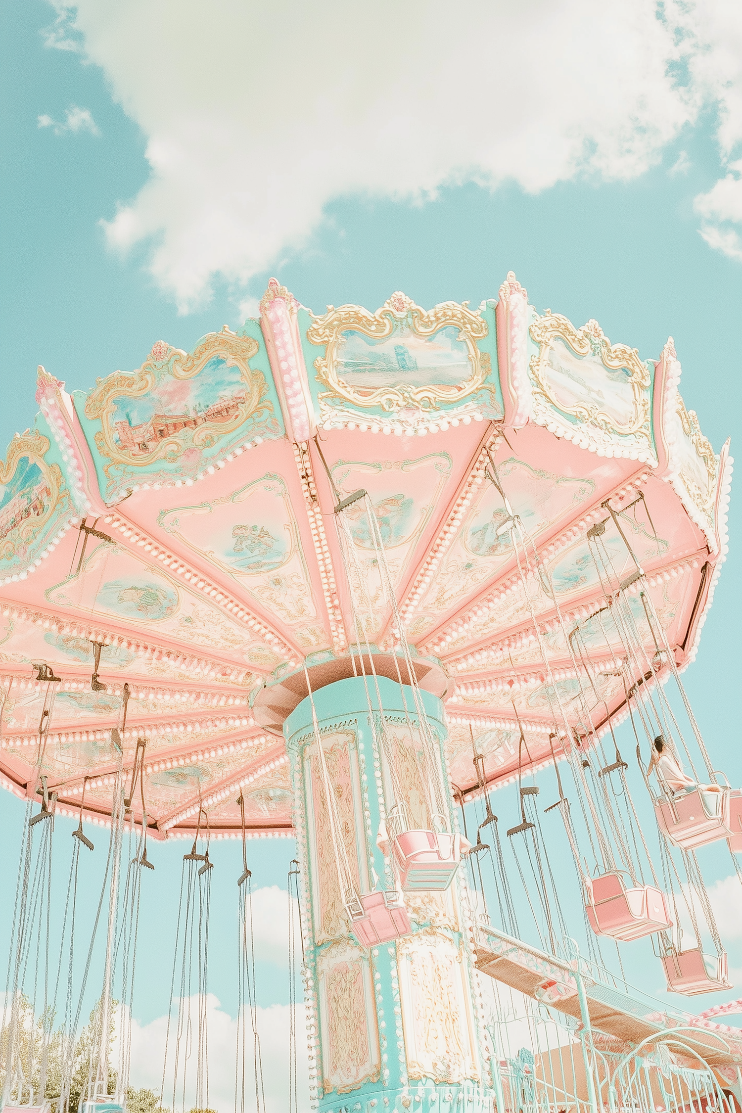 Pastel swing carousel with ornate designs against a bright blue sky, evoking nostalgia and whimsy in a dreamy amusement park setting.