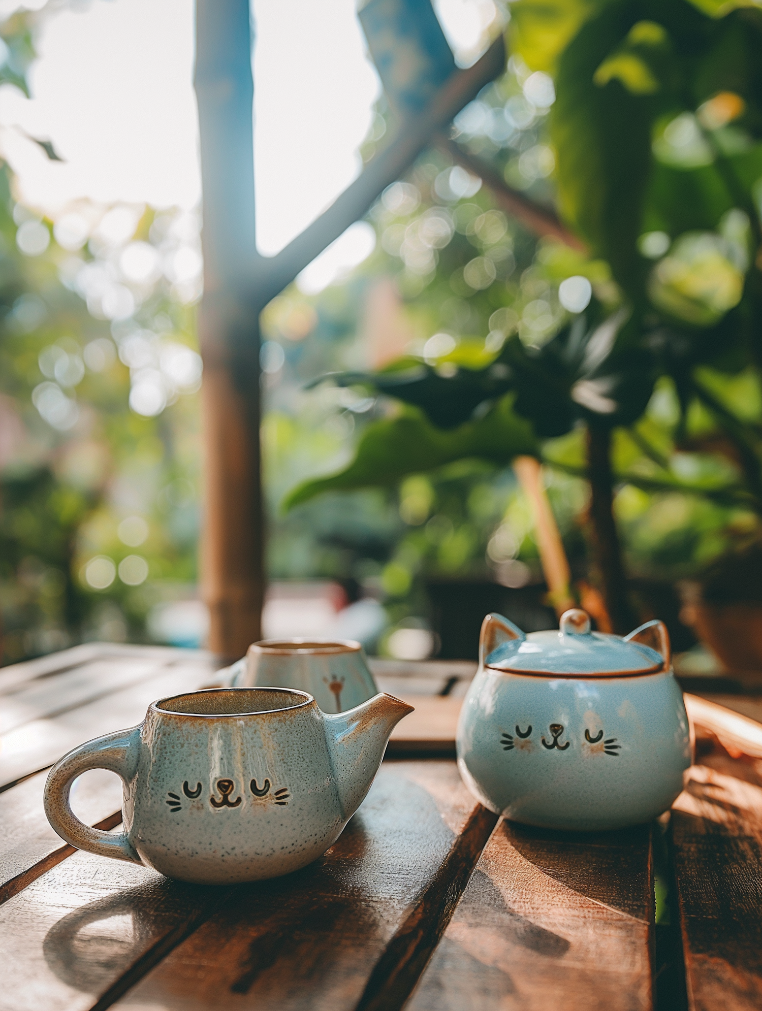 Charming blue cat-themed teapots on a wooden table in a sunlit garden, creating a cozy and whimsical atmosphere.