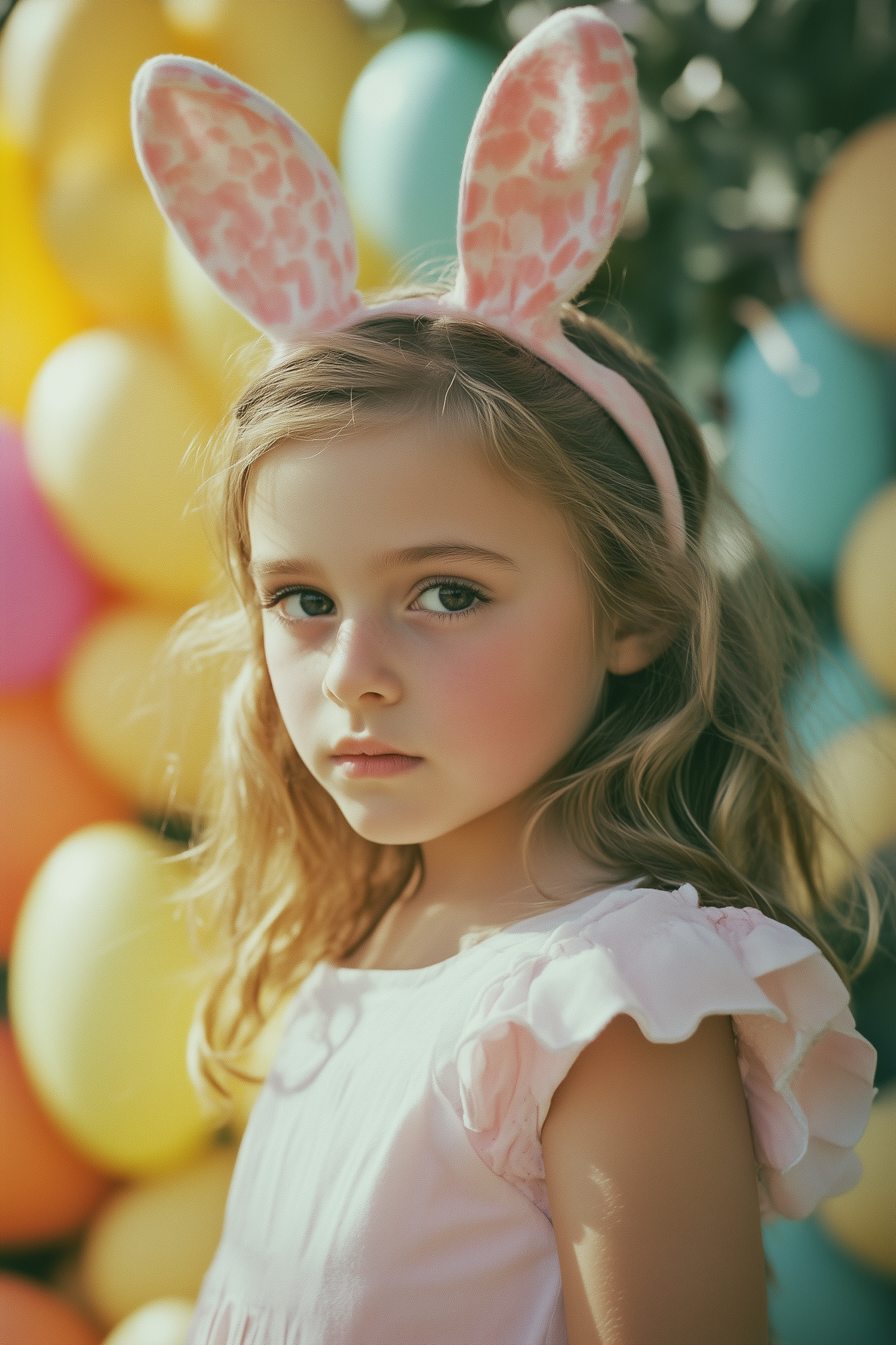 Young girl with bunny ears headband in front of colorful balloons, wearing a pink dress. Soft lighting highlights her delicate features.
