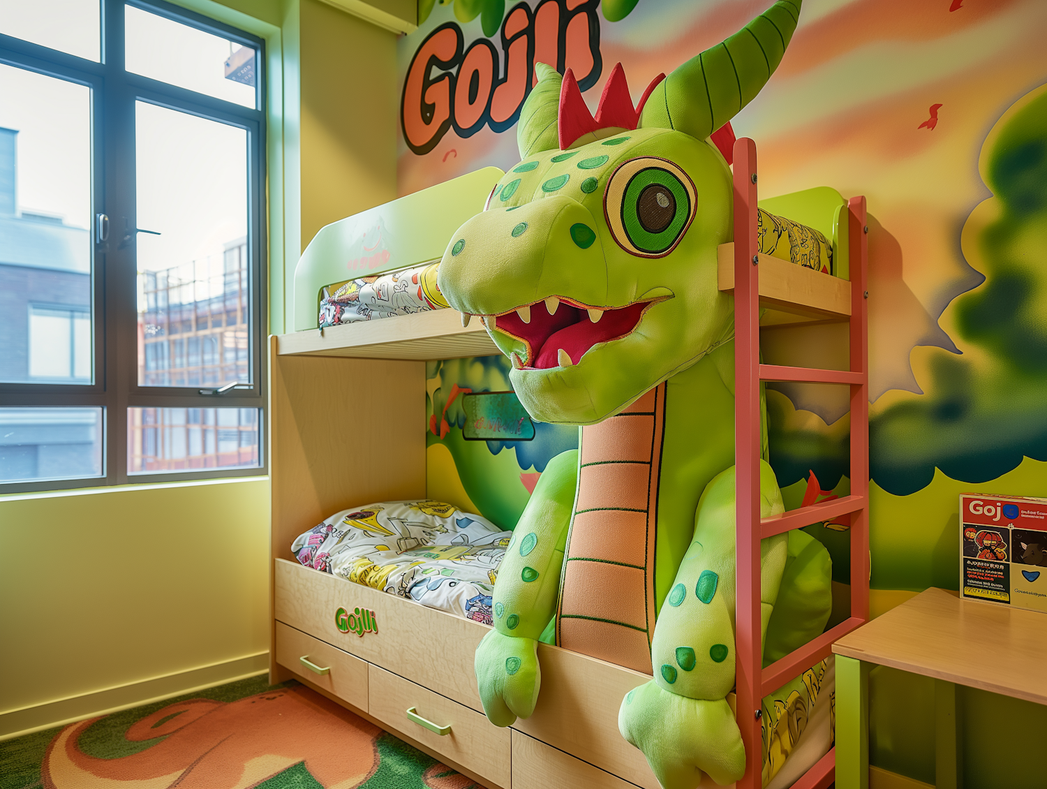 Bright children's room with a large plush dragon on a bunk bed, colorful mural, and natural light from a window.