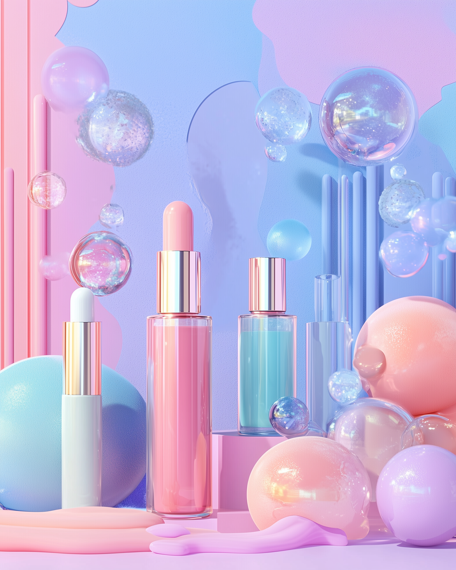 Whimsical pastel scene with cosmetic bottles, glossy spheres, and floating bubbles in pink and blue hues.