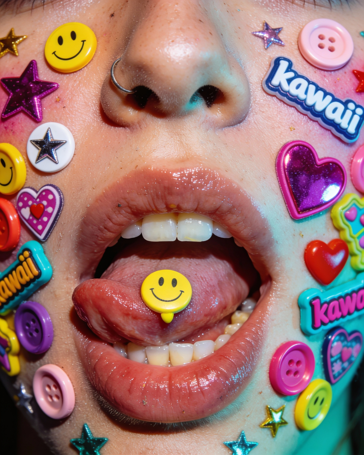 Extreme close-up of lower face: nose, lips, teeth, and tongue visible. Mouth open, tongue out. Skin is covered with puffy 90s-style stickers and buttons: smiley faces, stars, hearts, “kawaii” icons, colorful plastic badges clustered around cheeks and near mouth. A small round smiley sticker sits on the tongue tip. Lighting feels like direct on-camera flash—bright, punchy highlights, strong reflections on sticker plastic, slightly gritty retro snapshot energy. Colors are vivid (cyan, magenta, yellow). Very shallow framing, playful rebellious mood. Lighting: large softbox key light slightly above camera, gentle fill from opposite side, subtle rim light for separation, even exposure, no harsh shadows Camera feel: 85mm portrait look (or 70–105mm), f/2.8–f/5.6 depending on shot, ISO low, fast shutter, studio strobe feel