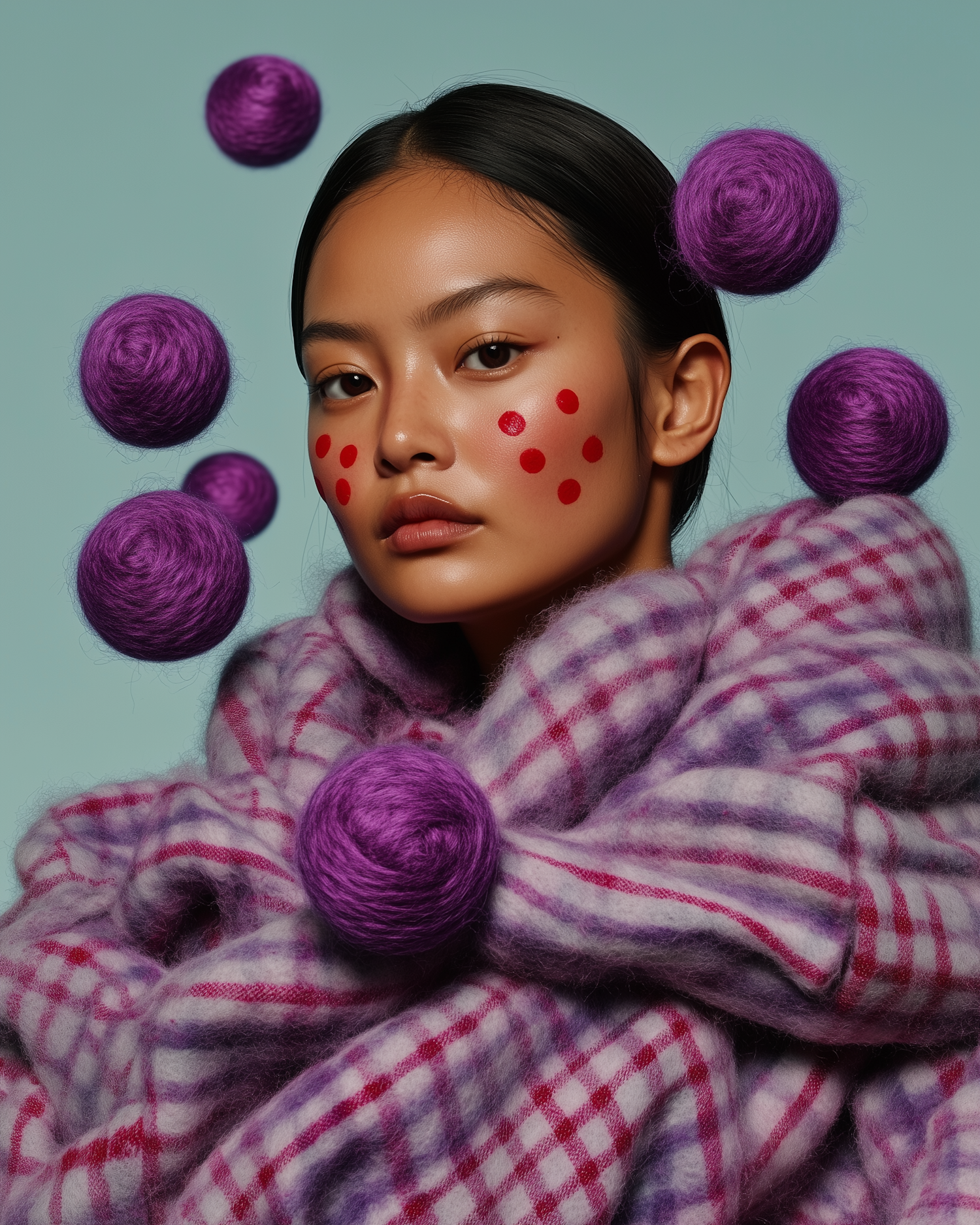 Whimsical portrait of a woman with red polka dots on her cheeks, wrapped in a plaid scarf, surrounded by floating purple yarn balls.
