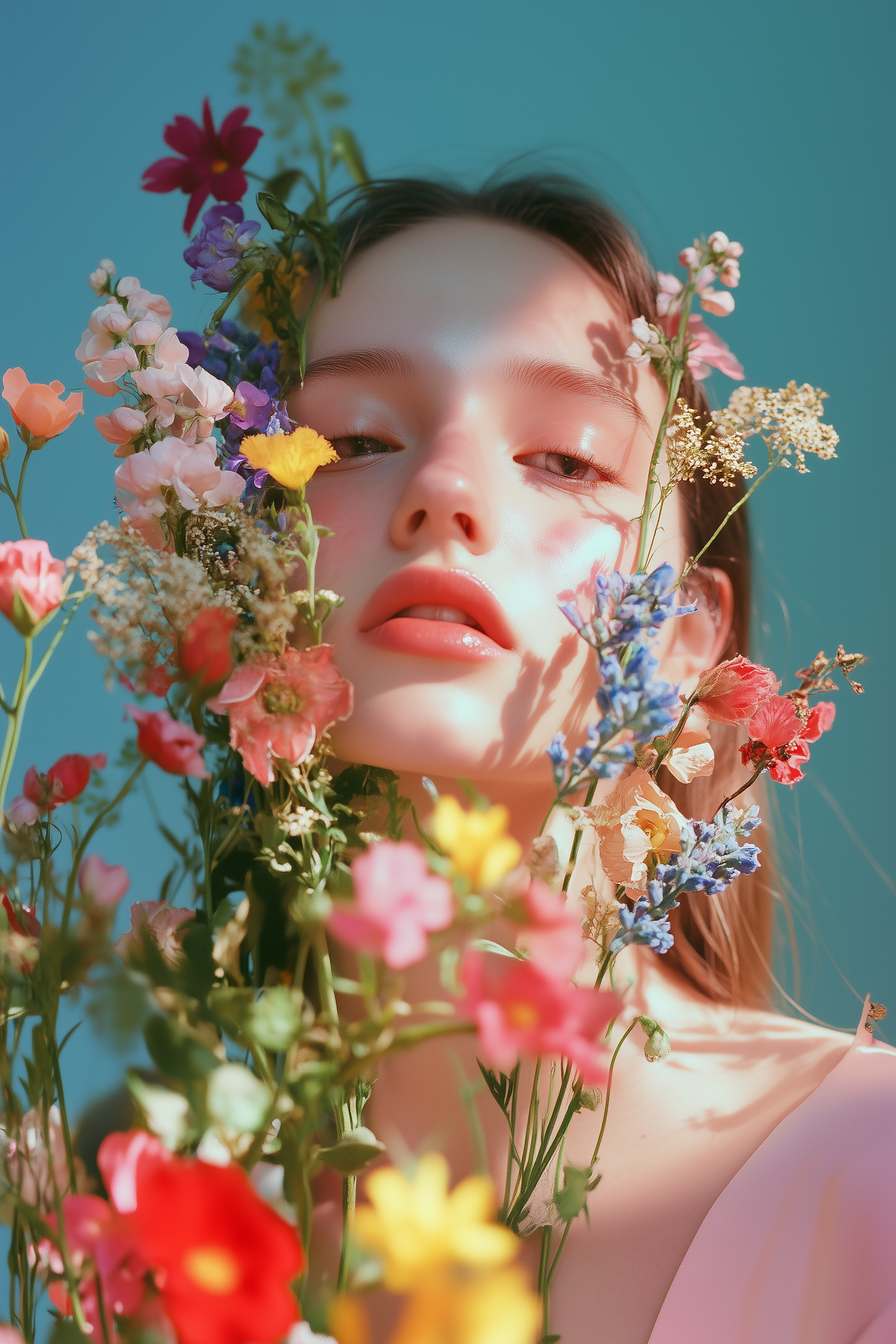 A serene portrait of a woman surrounded by vibrant flowers against a teal background, blending natural beauty and soft sunlight.
