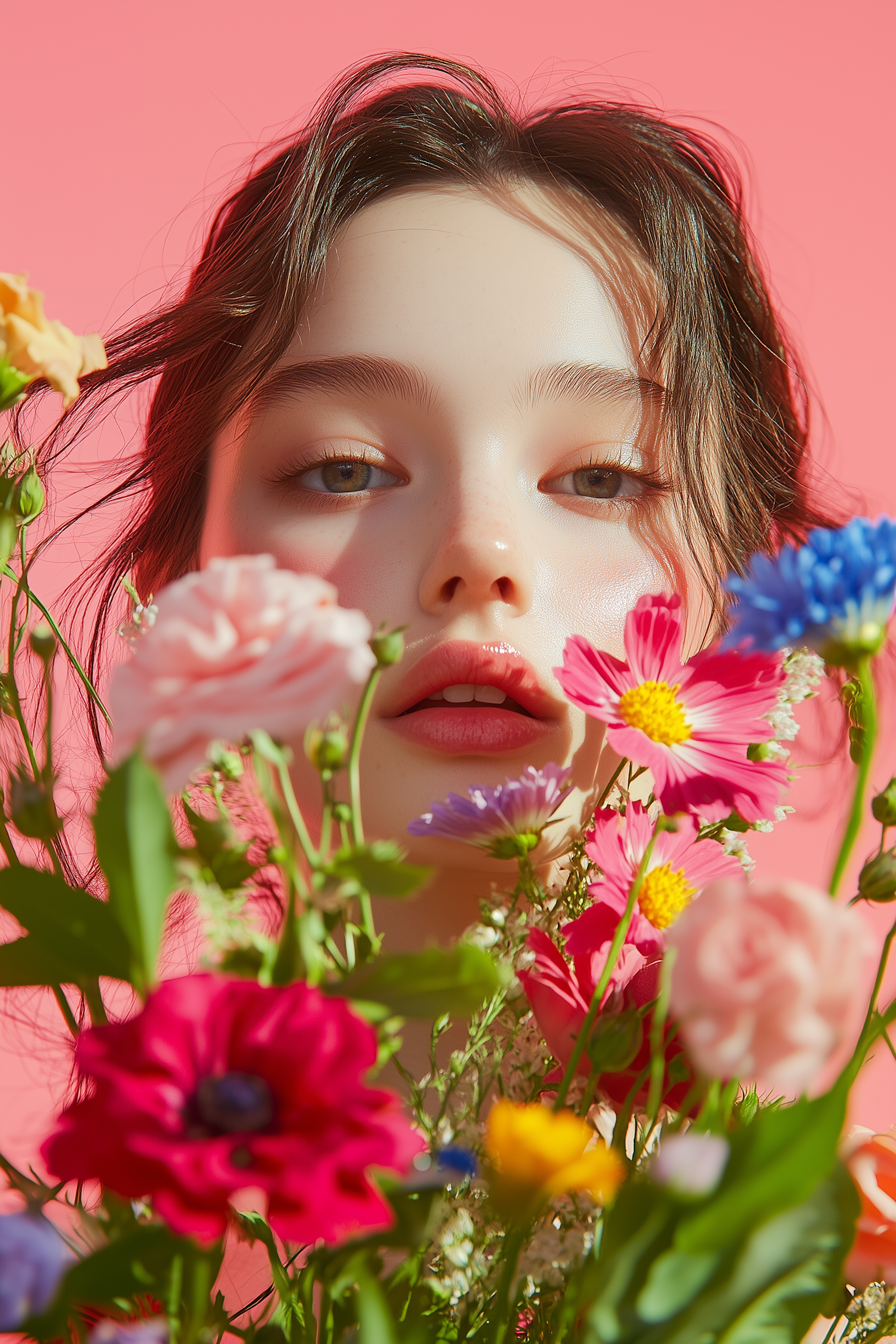 A dreamy portrait of a young woman surrounded by colorful flowers against a soft pink background, creating a whimsical and vibrant vibe.