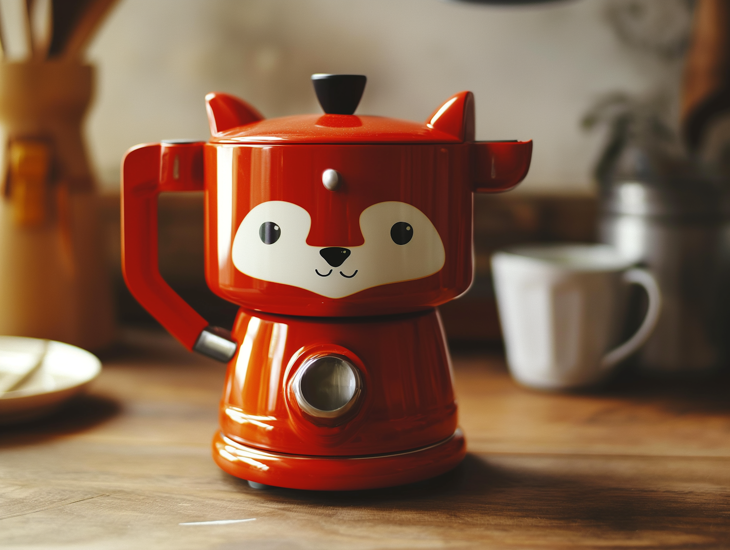 Charming red fox-themed coffee maker on a wooden counter, blending functionality with playful design in a cozy kitchen setting.