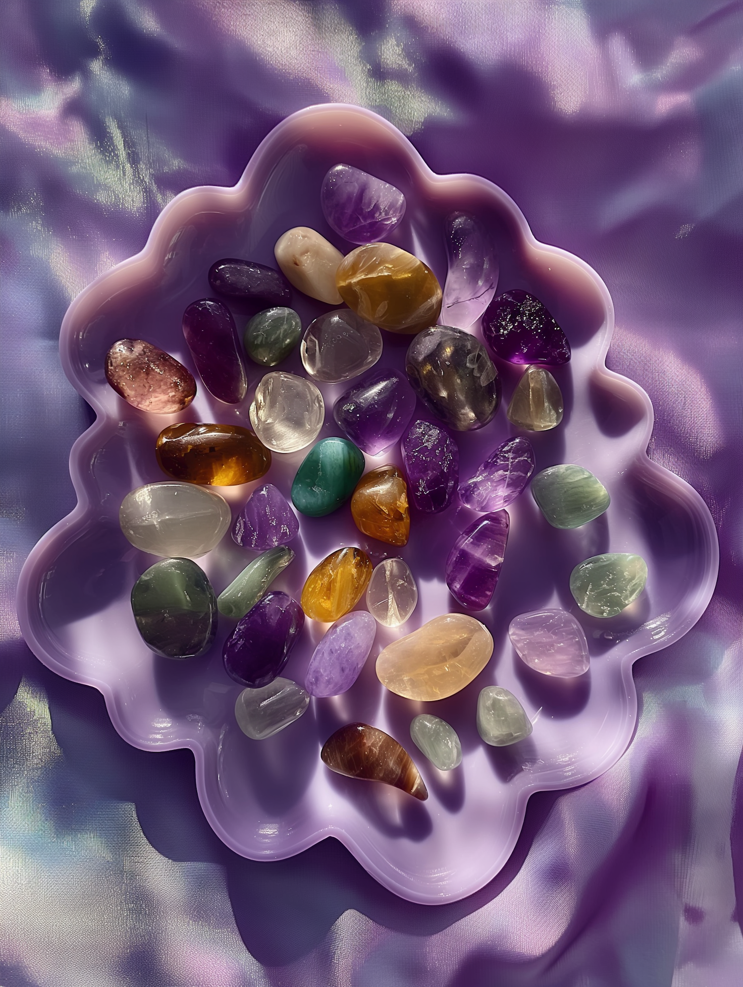 A collection of colorful polished gemstones on a pastel purple dish, set against a silky purple background with soft lighting.