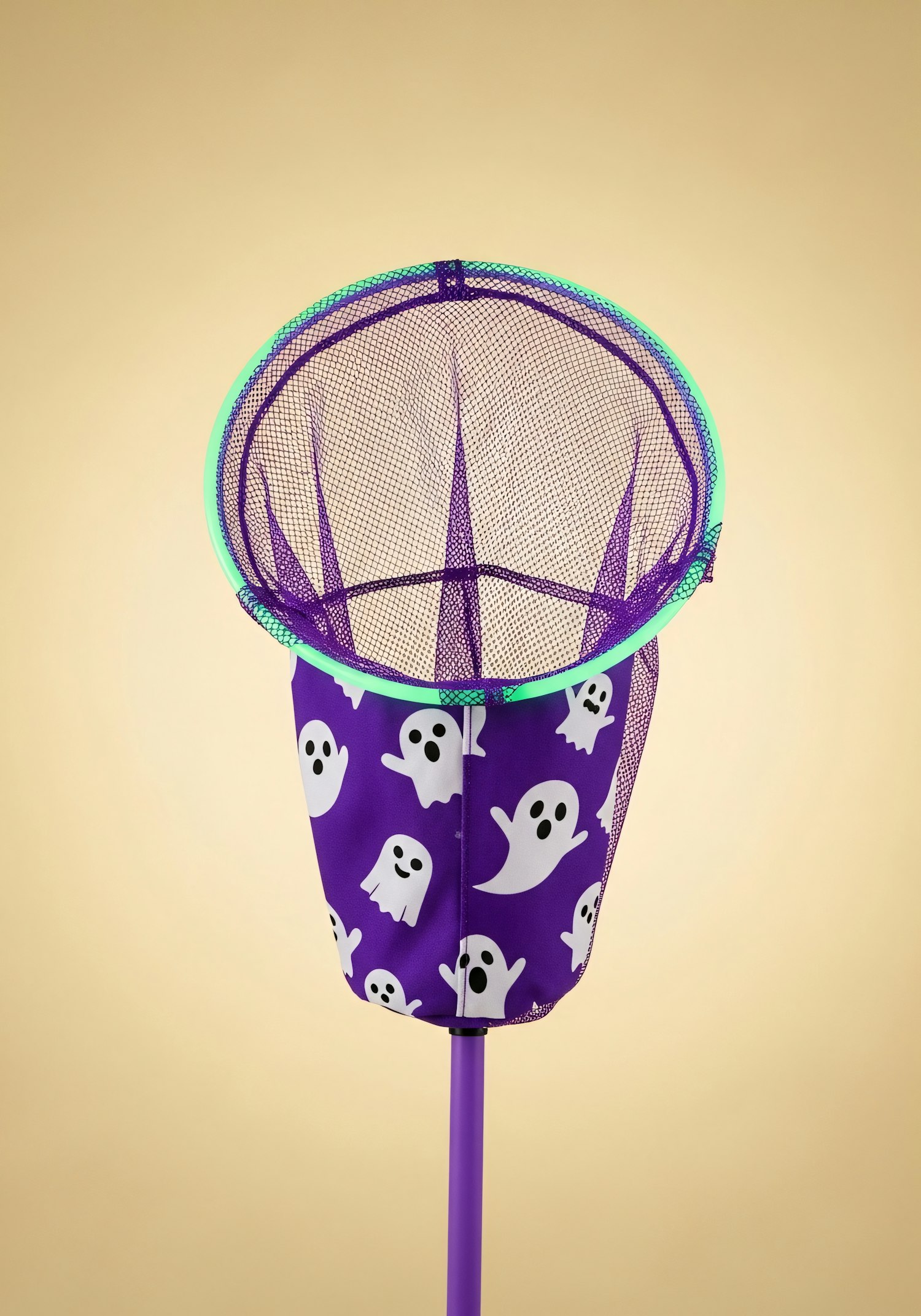 A vibrant purple net with a ghost pattern and neon green rim, perfect for playful activities or Halloween-themed fun.