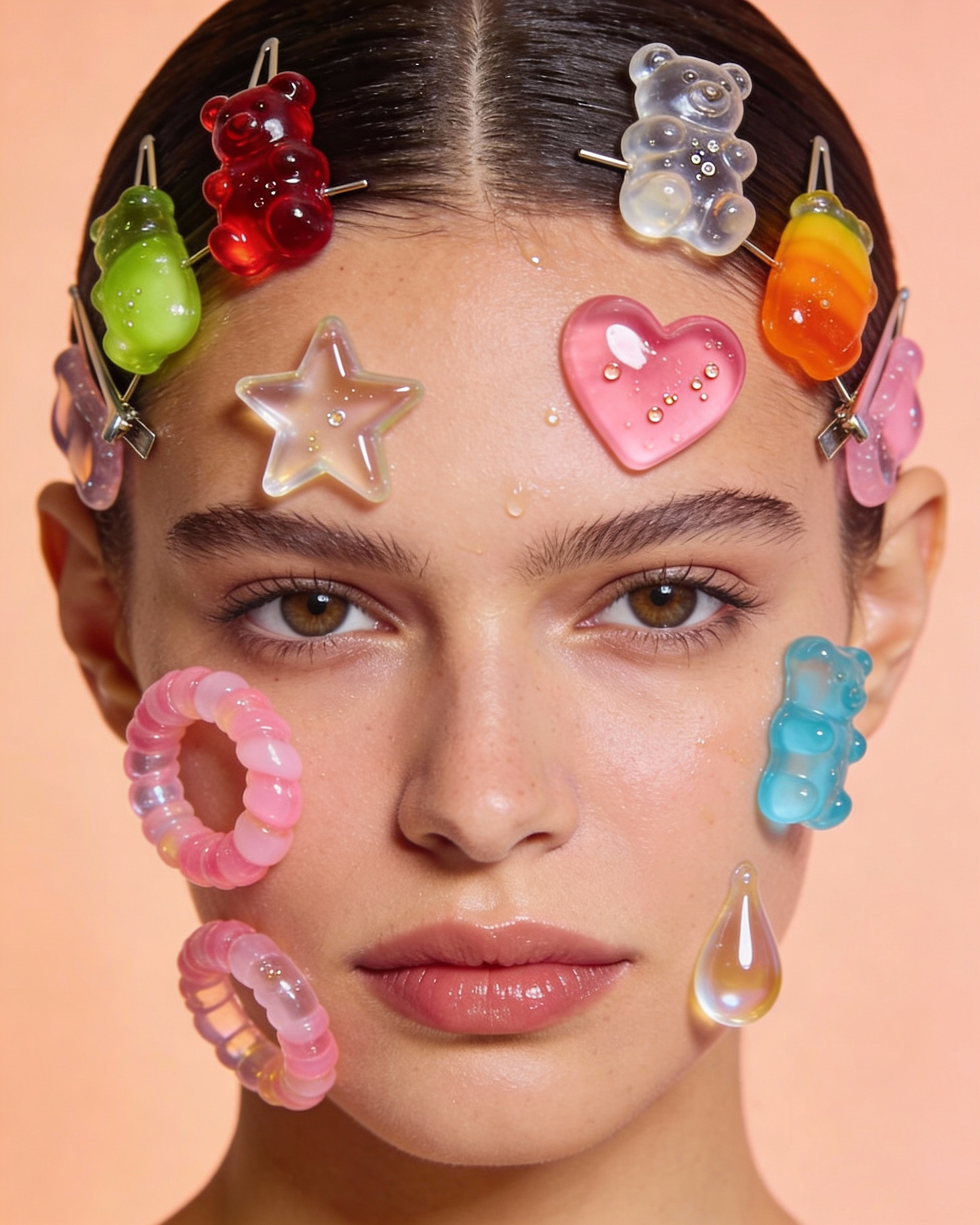 High-fashion beauty portrait of a person with sleek straight hair, center-parted and tucked behind the ears. Hair is decorated with translucent gummy accessories instead of traditional clips: gummy bears, gummy stars, jelly hearts, soft candy loops, and jelly droplets acting as barrettes and pins. The gummies appear semi-transparent, squishy, glossy, with light passing through them, subtle surface imperfections, and tiny air bubbles inside. Colors include cherry red, lime green, mango orange, bubblegum pink, and aqua blue. Face makeup is minimal and dewy to contrast the candy texture. Expression is calm and editorial. Background is a solid pastel peach studio backdrop. Lighting is soft but bright, emphasizing refraction and highlights through the gummies, ultra-sharp detail, luxury beauty photography, playful candy-core aesthetic.