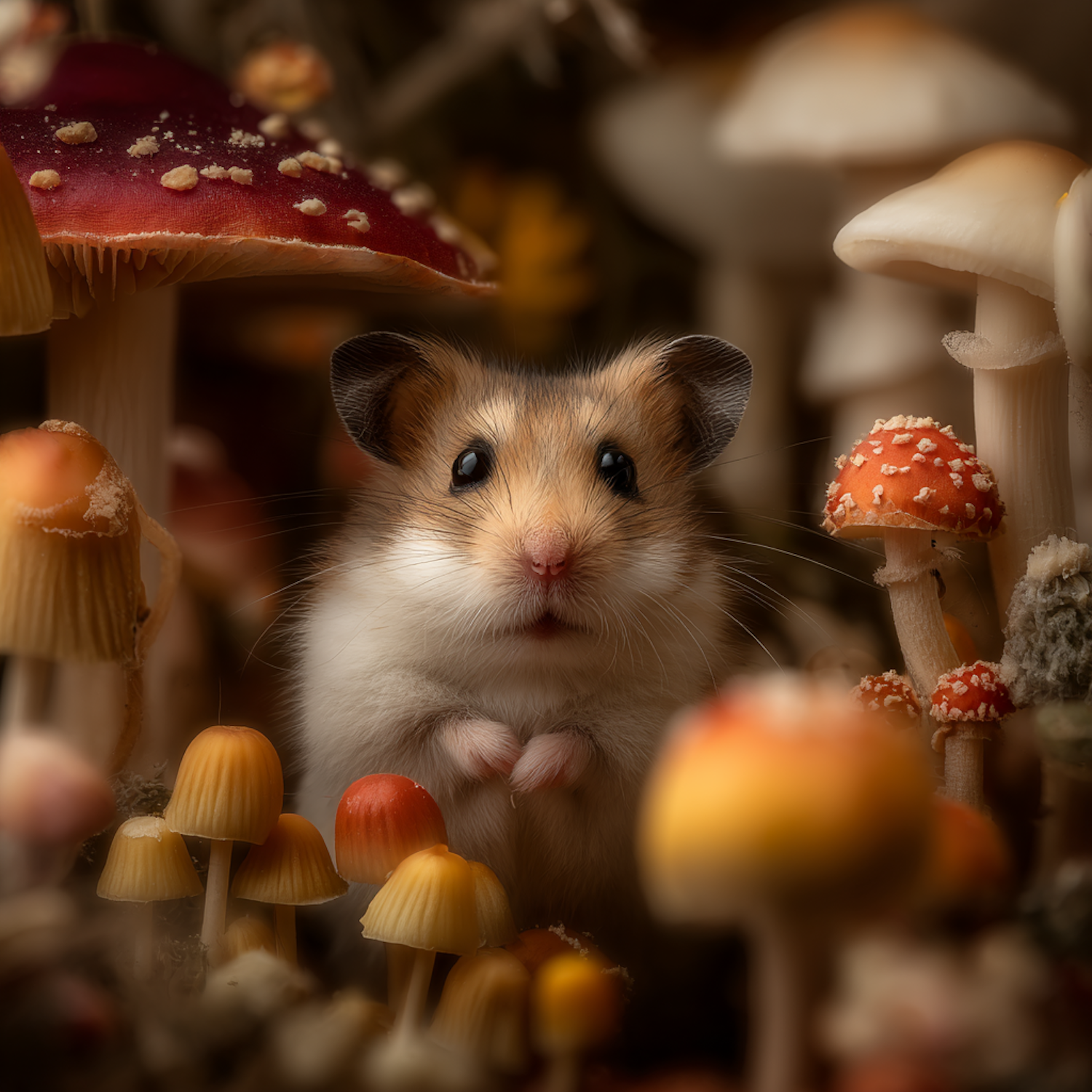 A cute hamster sits among vibrant mushrooms in a magical forest scene, creating a whimsical and enchanting atmosphere.