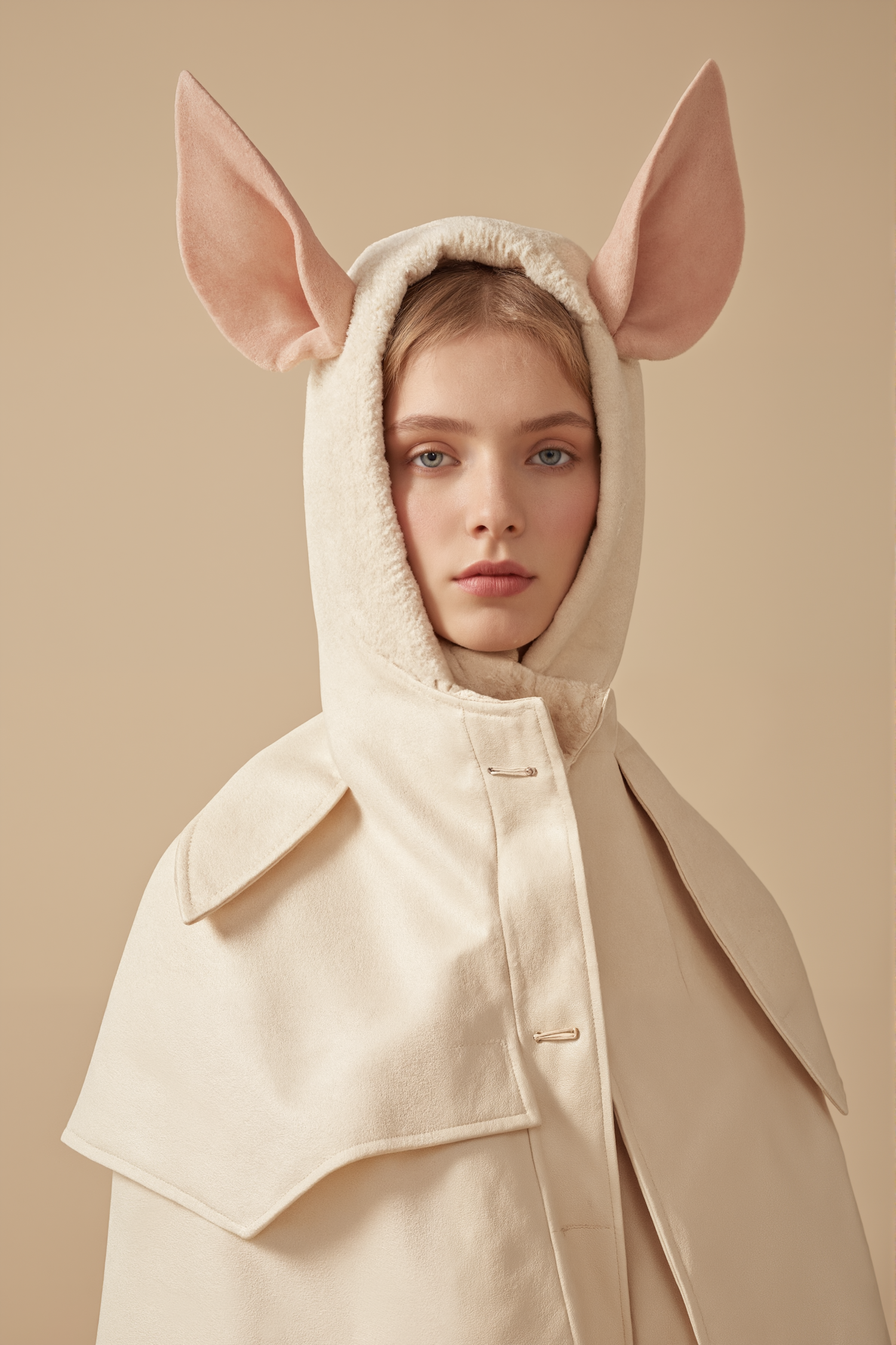 Whimsical portrait of a woman in a cream hooded cape with playful pink bat-like ears, set against a minimalist beige background.